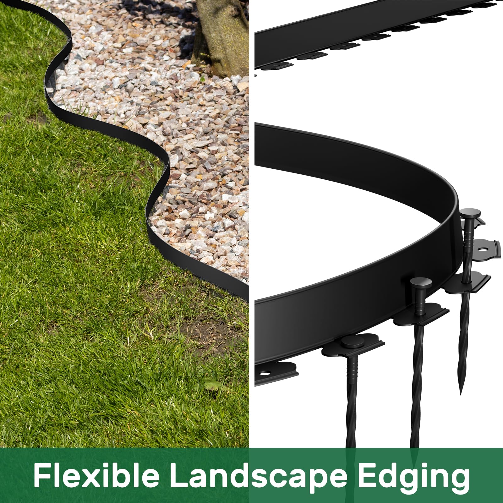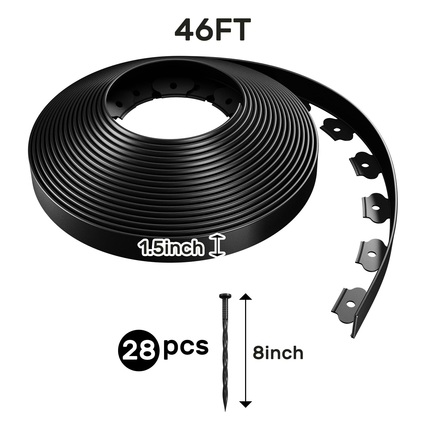 - EDGING FOR LANDSCAPING KIT: Includes one roll of 46ft (1.5" High) black garden edging & 28pcs spiral anchoring spikes.They can help you easily create a beautiful landscaped yard flower beds.