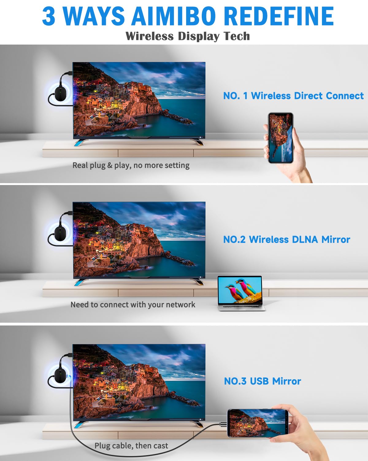 - 【 Truly Plug & Play Screen Mirroring】AIMIBO redefines wireless display technology with truly plug-and-play tech — no apps, no Wifi, no hassle. Designed to solve the biggest pain points for iOS and Mac users. Perfect for work, travel, or home entertainment.