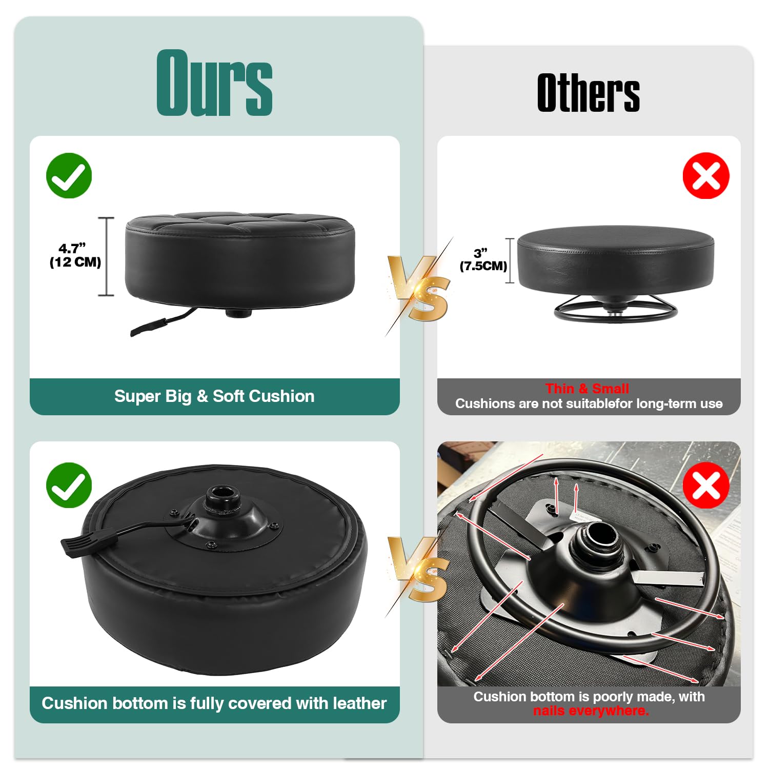 - Super thickened cushion and High-quality leather : Unlike those rolling stool that claim comfort but only provide thin (2"-3") and small cushions, we offer a truly super large and thickened cushion (4.7")which will essentially provide real comfort, not false promises. As shown in the video, this stool chair cushion is scratch-resistant and has a delicate touch, ensuring a very good experience for a long time.