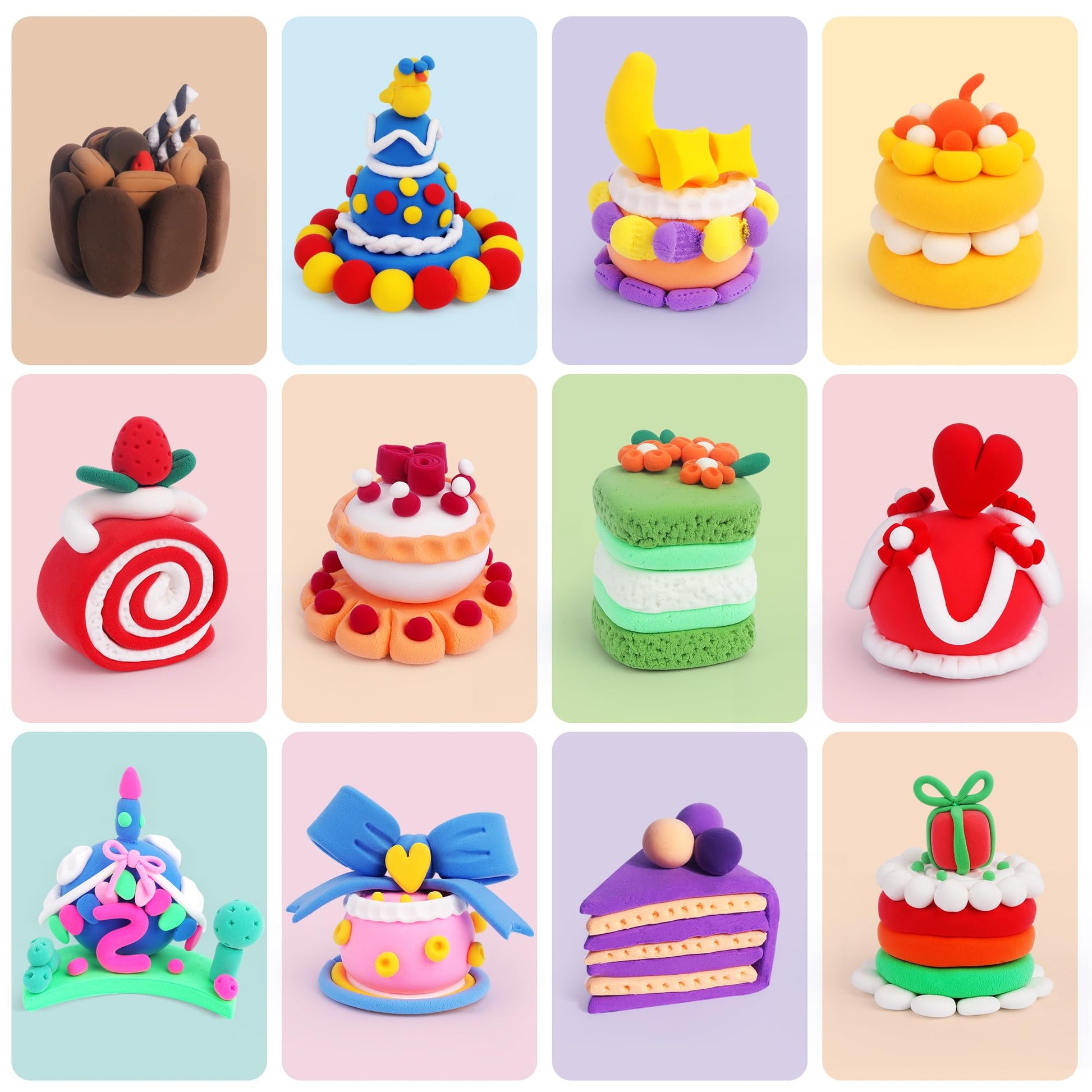 - Cake Theme Clay Kit: This modeling clay set includes 12 pre-portioned clay boxes (4 colors per cake), 8 sculpting tools, and step-by-step tutorial cards. With enough air clay to create 12 fun cake models, you can also store leftover clay in the included divided container to keep it fresh. Unleash your creativity with our complete air-dry clay kit!
