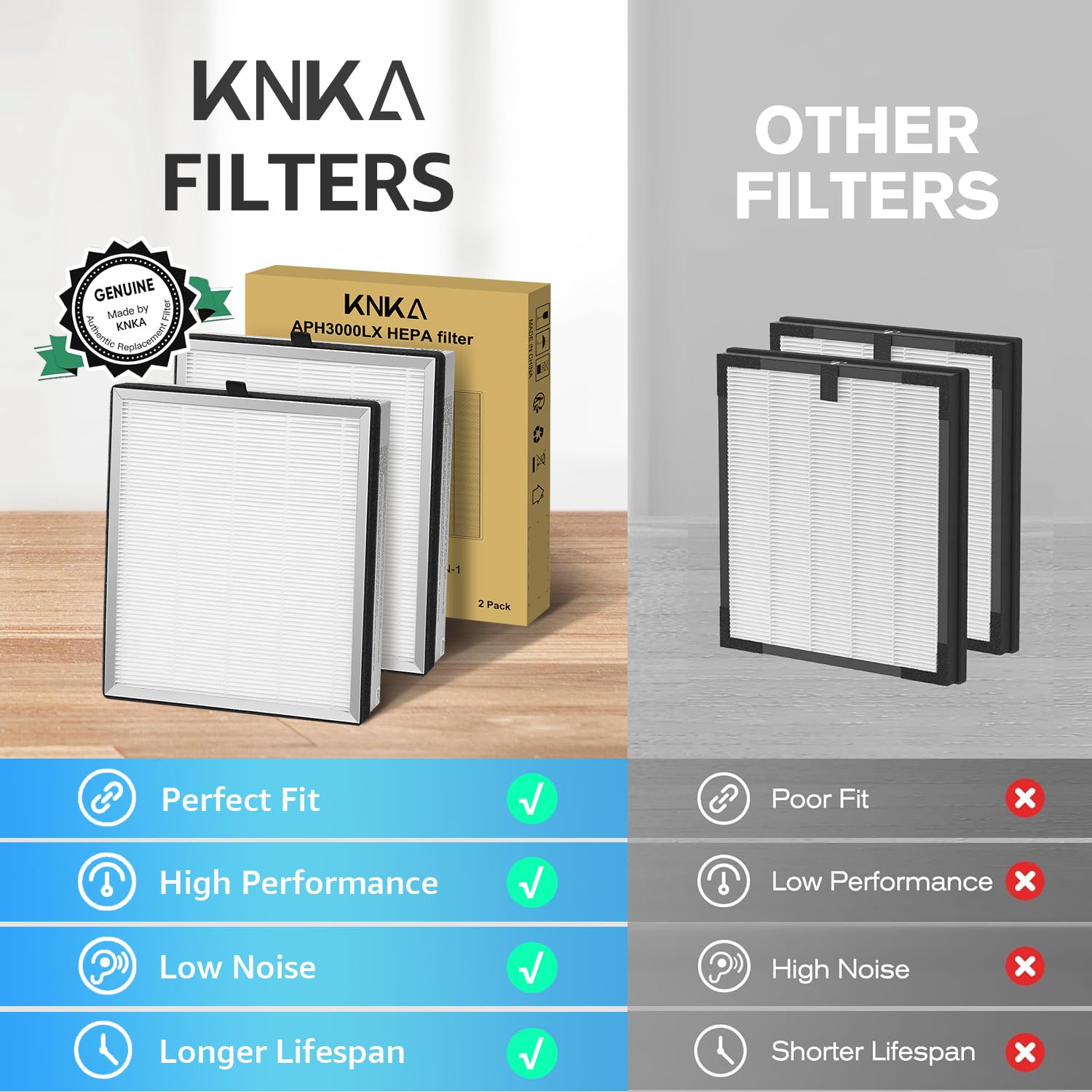 - Perfect Compatible with APH3000 Air Purifier: Genuine KNKA air purifier replacement filters guarantee certified fit and optimal performance. Off-brand filters frequently fail HEPA testing standards, fit incorrectly, reduce efficacy, and may cause damage to your KNKA air purifier. Only when used in conjunction with a genuine filter will your purifier work efficiently.