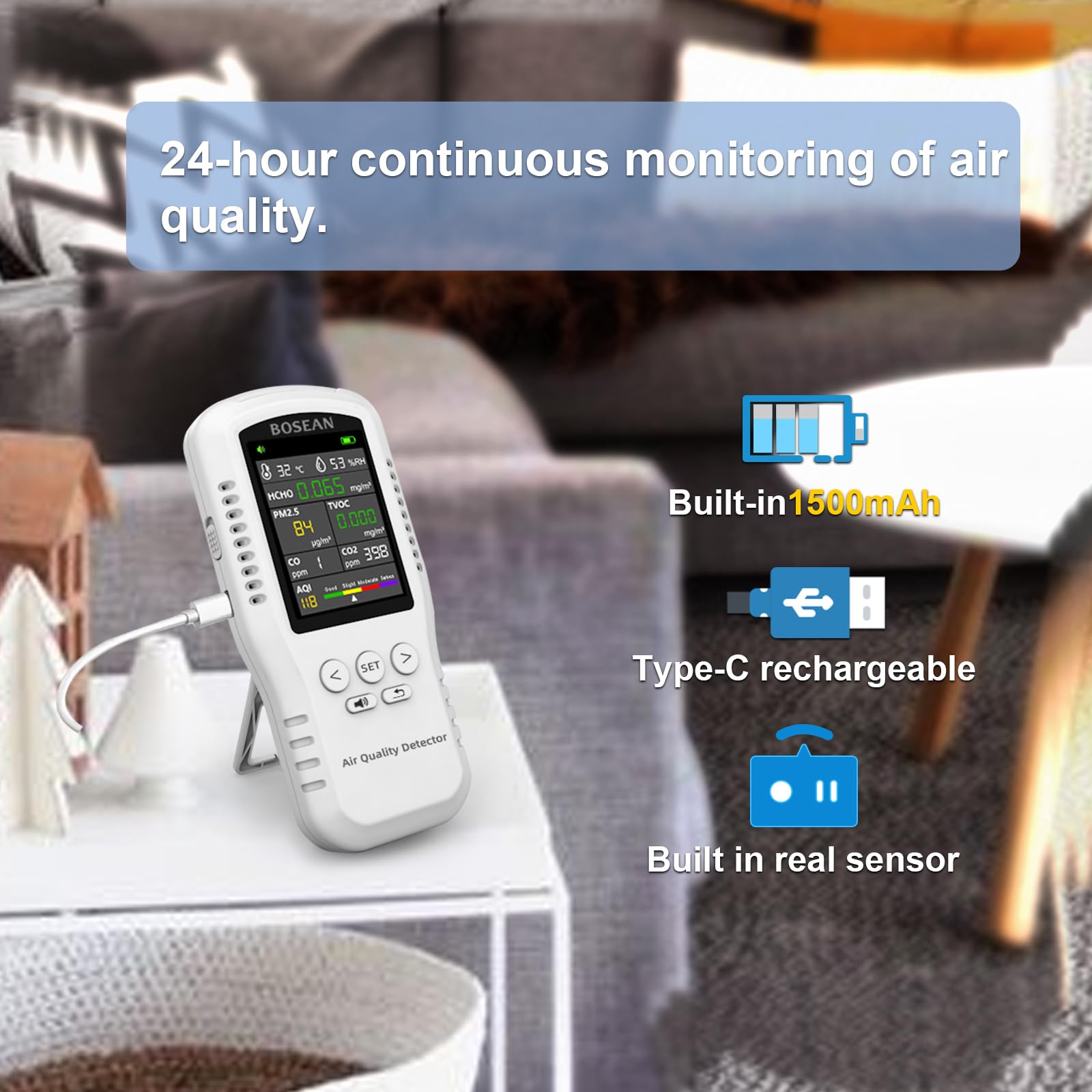 - 【EASY TO OPERATE】Air Quality Detector has a 1500mAh rechargeable lithium battery and packed with Type-C cable that can last up to 4-5 hours. its easy to operate with just pressing the power on/off button, A button realizes all operations,design with LCD Color Screen Digital Display, it can offer mean value for each gas,It helps detect harmful HCHO and TVOC around your room in the real time.
