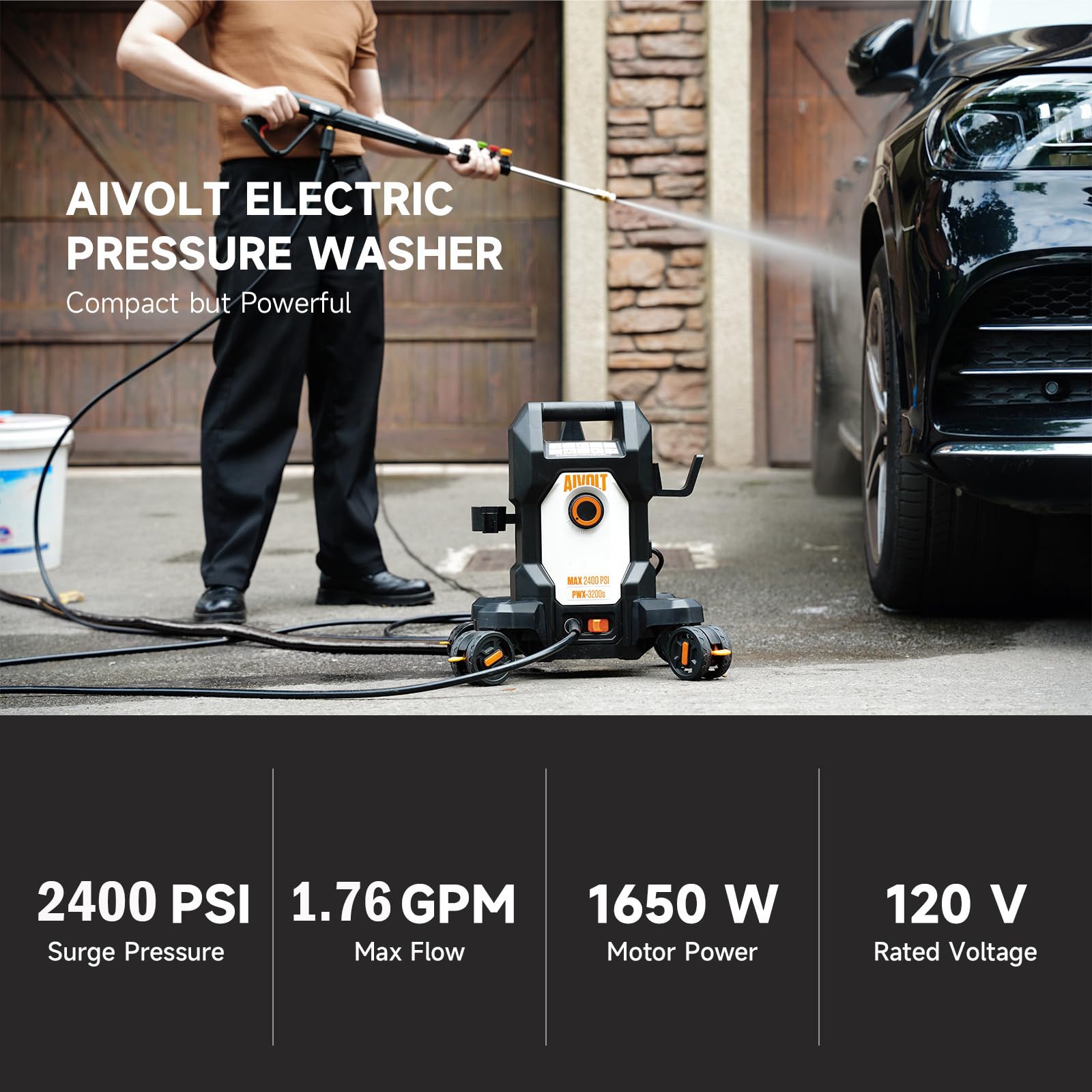 - 【Powerful & Efficient Washing Pressure】AIVOLT Pressure Washer delivers professional-grade 2400 PSI for home cleaning needs. Equipped with a high-performance 1650W motor (8850 RPM), it maintains consistent powerful pressure even during extended use. The 1.76 GPM water flow ensures optimal balance between high pressure and water efficiency, making it ideal for cars, houses, gardens, driveways, patios, and outdoor furniture