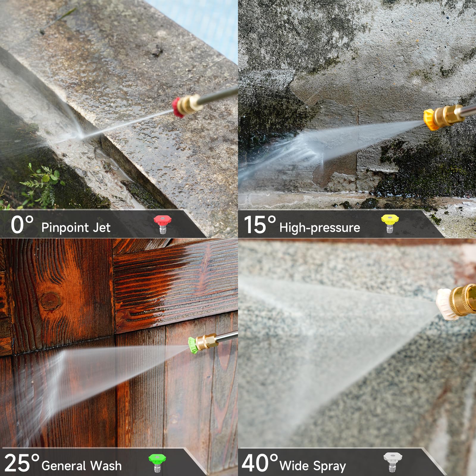 - 【Accessories Include】Comes with 4 quick-connect nozzles (0° pinpoint jet, 15° high-pressure, 25° general wash, 40° wide spray), 1 high-pressure foam cannon, 1 spray gun, and 1 nozzle-cleaning brush. All accessories ship pre-packaged with the pressure washers—plus an installation toolkit for full setup in under 3 minutes