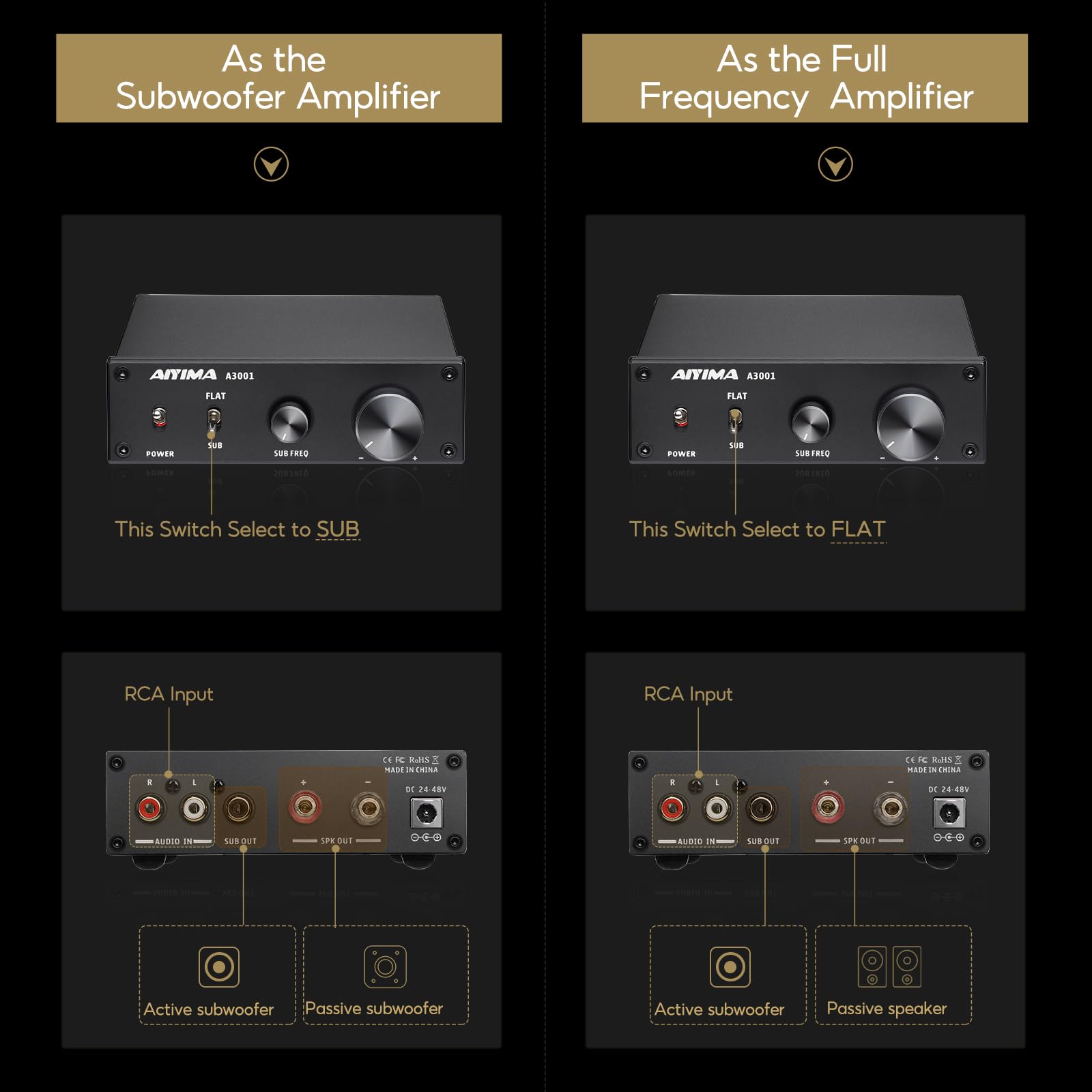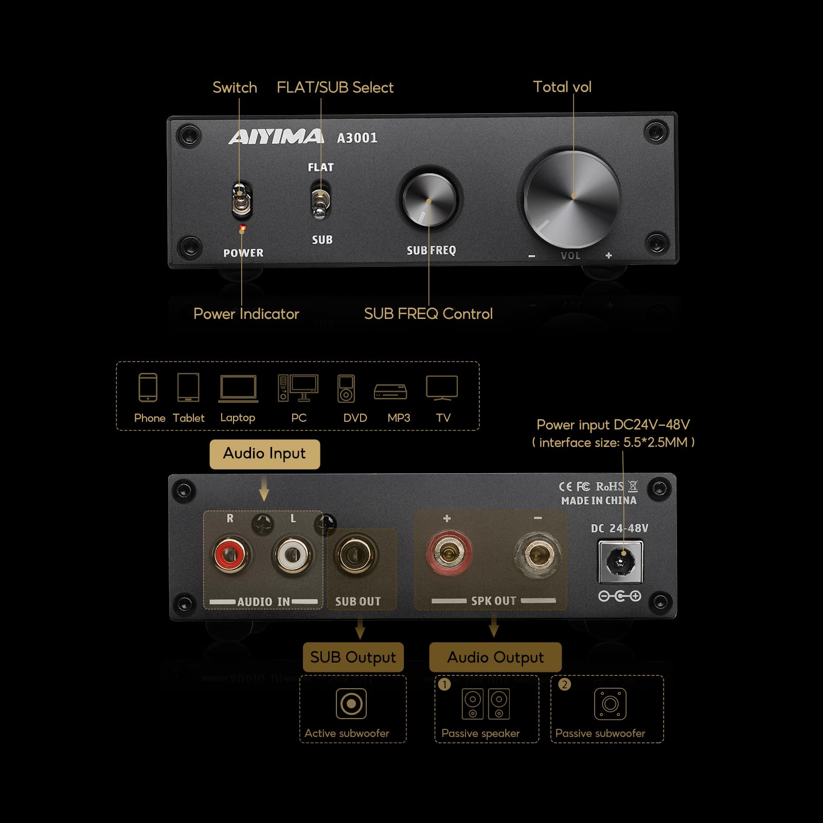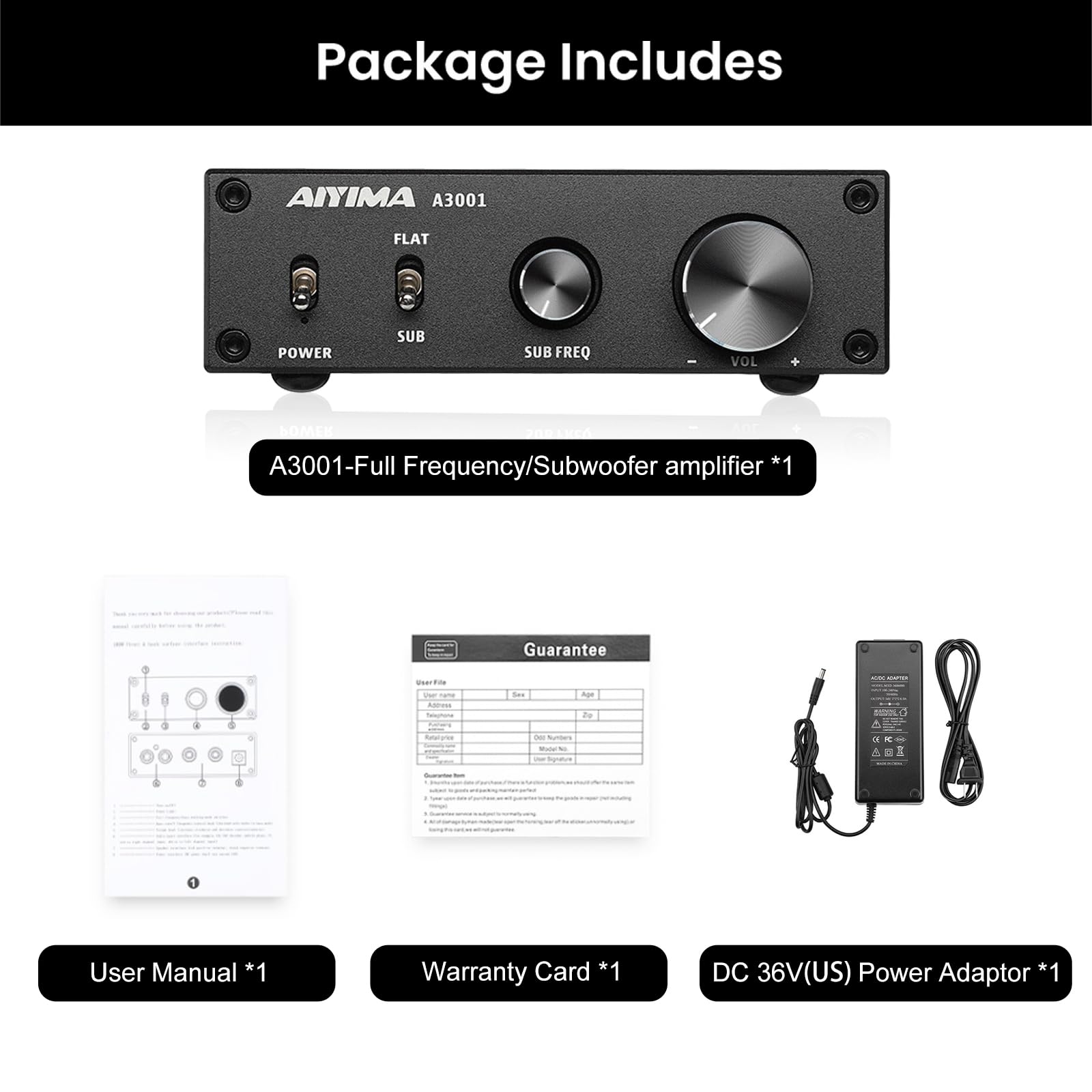- ❶ Adopt The Instruments TPA3255D2 chip, NE5532 op-amp. Very Quiet, Runs Extremely Cool,Easy to set up,Ship With 36V 6A power adapter,so our AIYIMA A3001 Subwoofer Amplifier can driver most home passive speakers and powered subwoofers