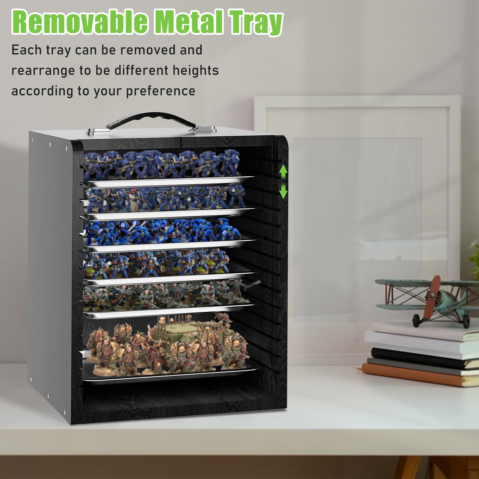 - 【6 METAL TRAYS】Dimension:13"L×10"W×15.7"H.This miniature case includes 6 black painted trays that can be secured with magnets to ensure the miniatures stay in place during shipping or storage. The tray slides easily for easy storage and viewing of items inside. The height of the tray can be adjusted to accommodate different sizes of miniatures.