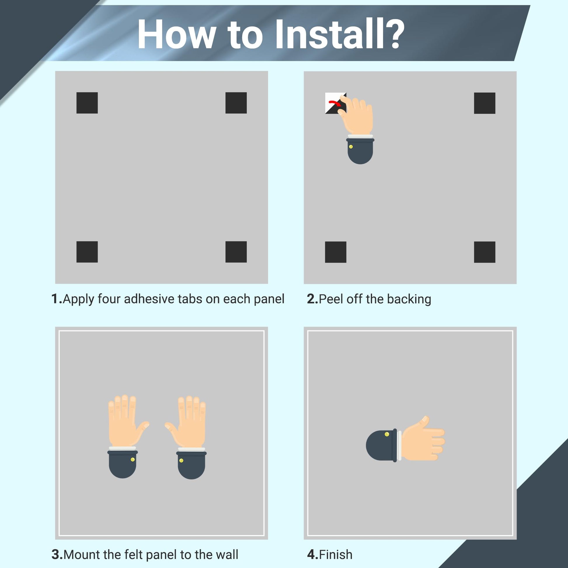 - Safe Removable Adhesive: 11.8 "x11.8" felt panels with 48 acrylic double-sided tapes, safe for your walls, suitable for working perfectly on flat, textureless, dust-free, dry surfaces and can be easily removed without damaging the wall paint, a perfect solution to pin your notes and messages in any office, home or commercial environment