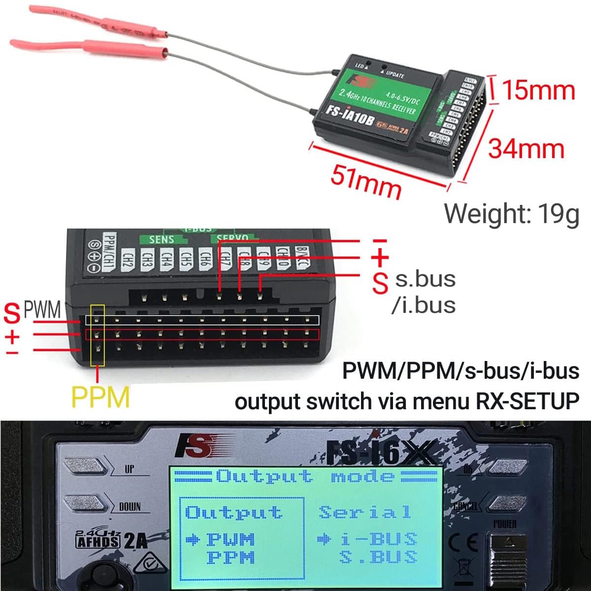 - FS-iA10B Output PWM 10CH / PPM 8CH / S.bus 10CH / i.bus 10CH (Select from transmitter menu 'SYSTEN-RX setup-Outprt mode'). Receiver is compatible with multiple RC aircraft and Car Boat connection modes.