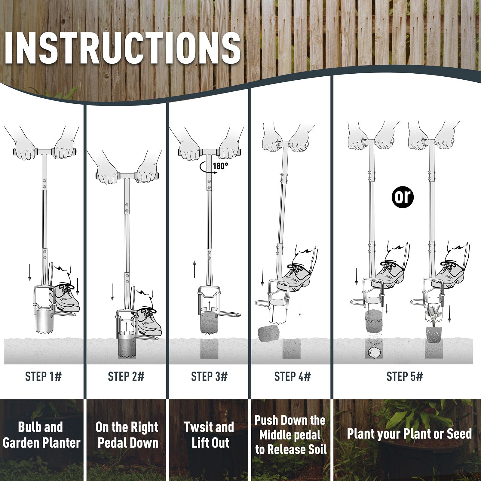 - READY TO PLANT - Step, twist, pull and you’re ready to plant. Step down the middle pedal, you can control how deep want to go into the dirt. Step down the right pedal effortlessly release your soil. The 5-in-1 bulb planting tool allows you to work from a standing position, saving your back and knees.