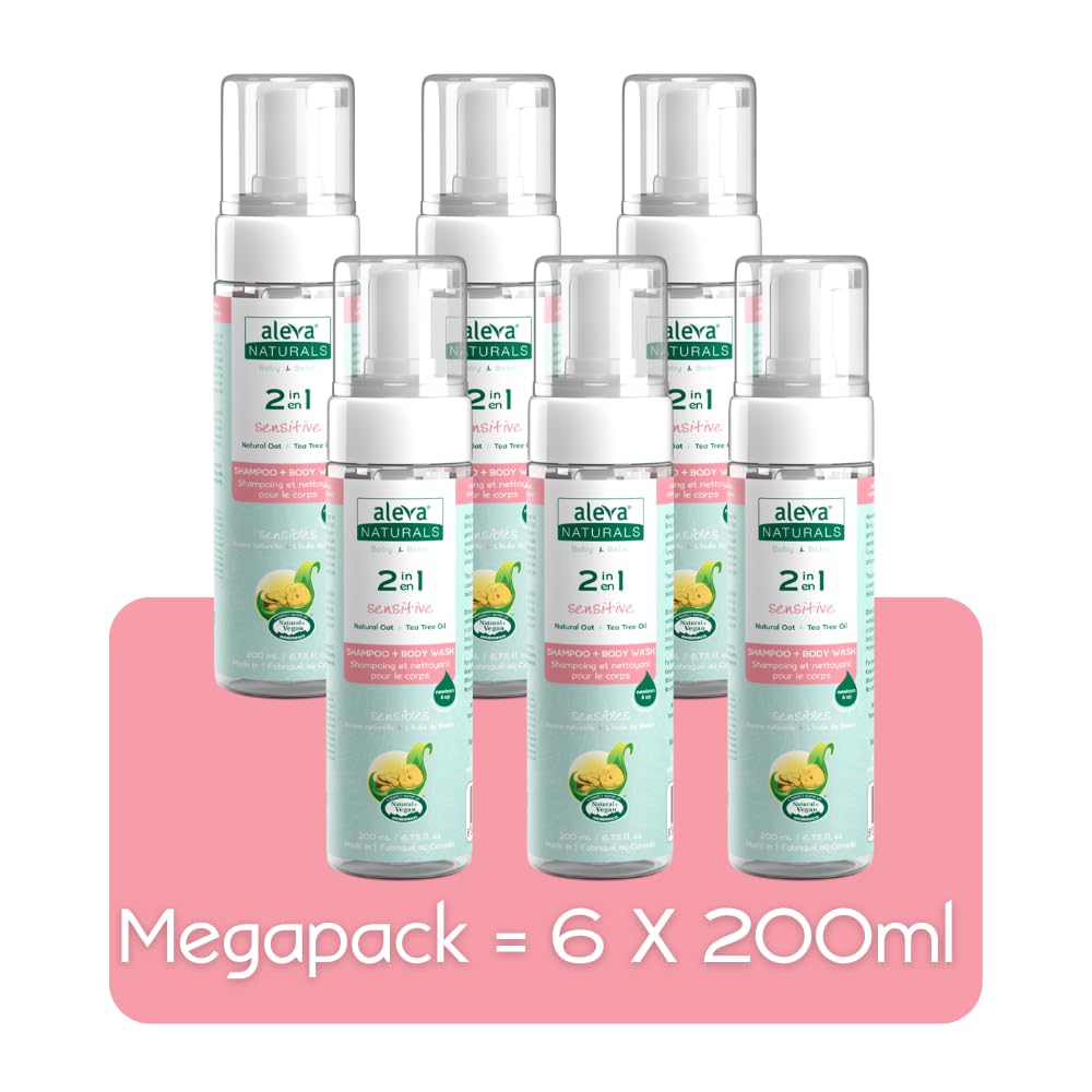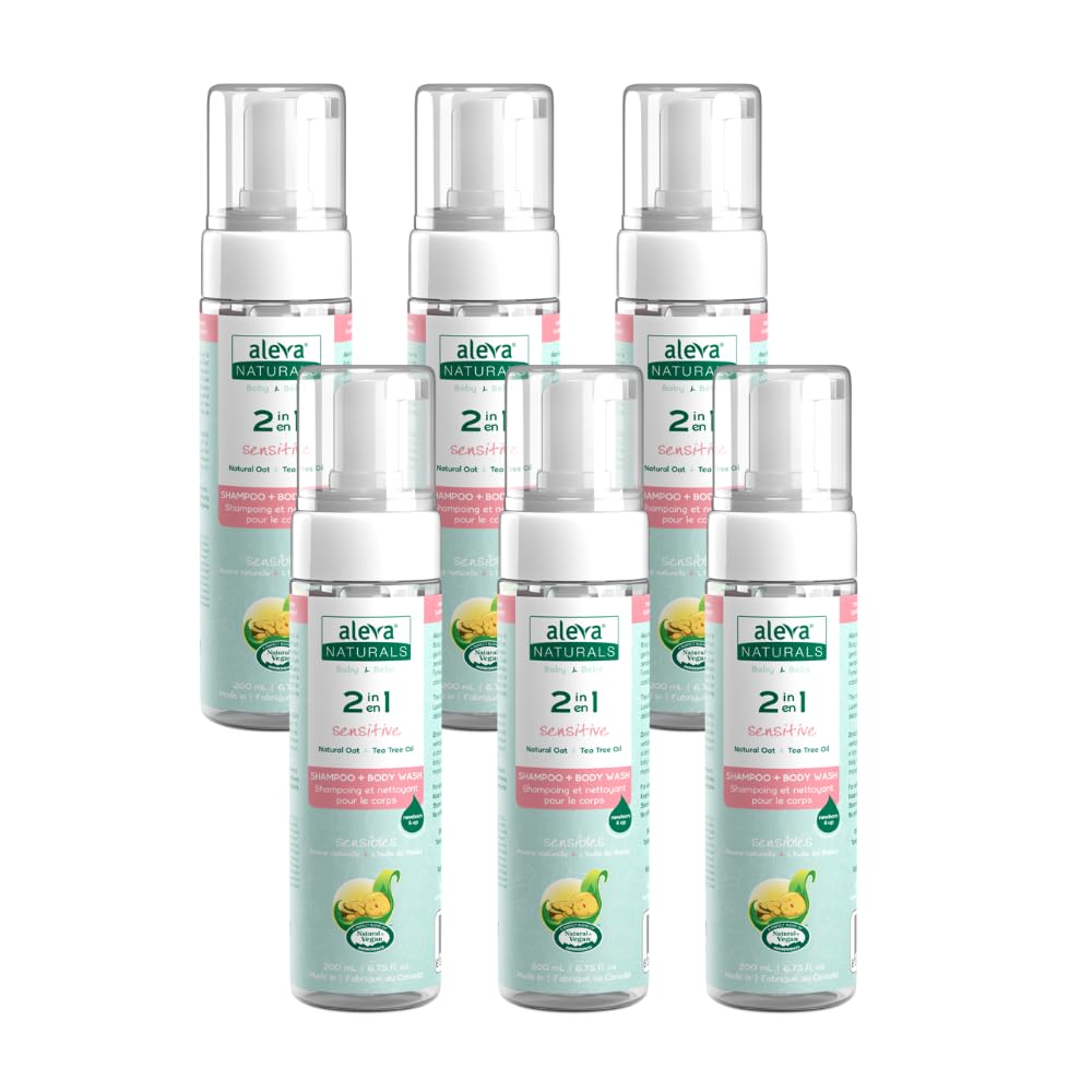 Details: Gently cleanse your baby's skin and hair with Aleva Naturals 2 in 1 Shampoo + Body Wash. Specially formulated to be gentle on your newborn's sensitive skin, this baby shampoo wash leaves skin and hair clean and touchably soft. This wash comes in a unique self-foaming bottle to make bath time easier for babies and parents. The pH balance ensures that this Shampoo + Body Wash is mild and gentle on eyes and sensitive areas. The Tea Tree Oil formula helps wash away flakes associated with Cradle Cap, while the combination of Oatmeal Extract and Chamomile Oil leaves your baby's skin soft and smooth. This baby shampoo wash is hypoallergenic, free of parabens, phthalates, sulfates, and dyes. Like all Aleva Naturals products, the 2 in 1 Shampoo + Body Wash is made with premium quality ingredients, so you can enjoy a safe product without harsh chemicals or additives. Formulated for newborns babies. Cleansing soothing mild shampoo body wash for babies Ideal for babies with cradle cap sensitive skin Unique foaming formulation Made with plant-based ingredients Enriched with Tea Tree Chamomile Oils Great for everyday! For newborns babies. Made in Canada🍁