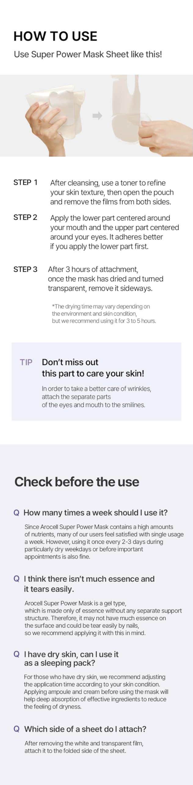 Details: ◦ 1 box contains 4 individually packed masks with highly concentrated active ingredients ◦ A thick yet soft hydrogel mask that adheres to the skin evenly AROCELL Super Cell Power Mask possesses collagen and a growth factor technology penetrating deep into the skin for intense and long-lasting hydration. It results in well-moisturized and supple skin, while also reducing the appearance of fine lines and wrinkles, and dryness. This mask offers remarkable vital benefits; it enhances firmness and elasticity with the help of nutrient-dense ingredients while promoting radiance through rapid moisture replenishment. It achieves this through a Bio-cosmetic solution that is stabilized with growth factor, Exosome, Liposomes, Collagen, and anti-aging peptide ingredients.