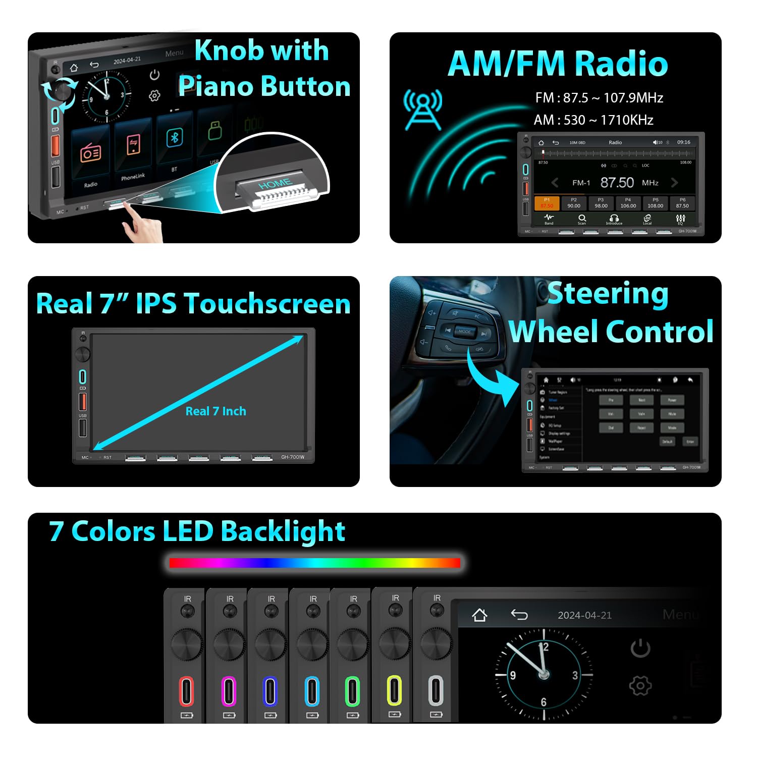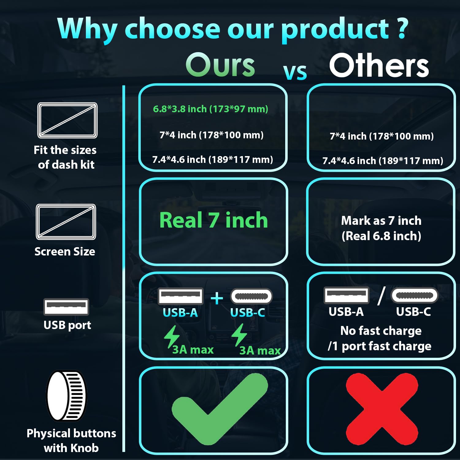 - Real 7 inch HD touchscreen with knob & fit 6.8"*3.8"(US double din standard) dash kit. While others list 7" touchscreen but the real size is 6.8";Or others list is real 7" touchscreen & fit 6.8"*3.8" dash kit but without knob.