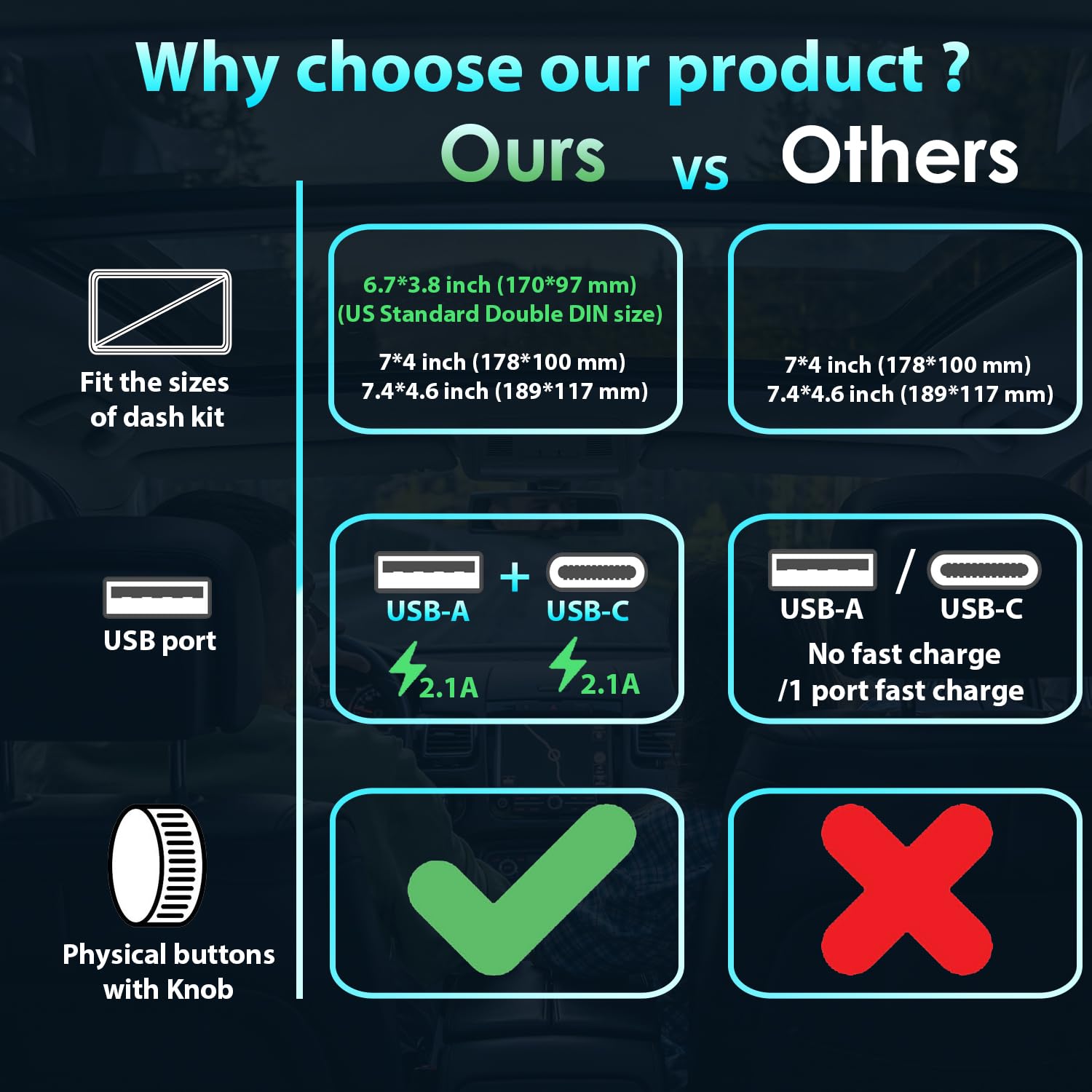 - Compatible with Wired/Wireless Apple CarPlay & Android Auto: This double din car stereo is compatible with both Wired/Wireless CarPlay and Android Auto, allowing you to access music, make phone calls, send messages, and navigate using voice assistants