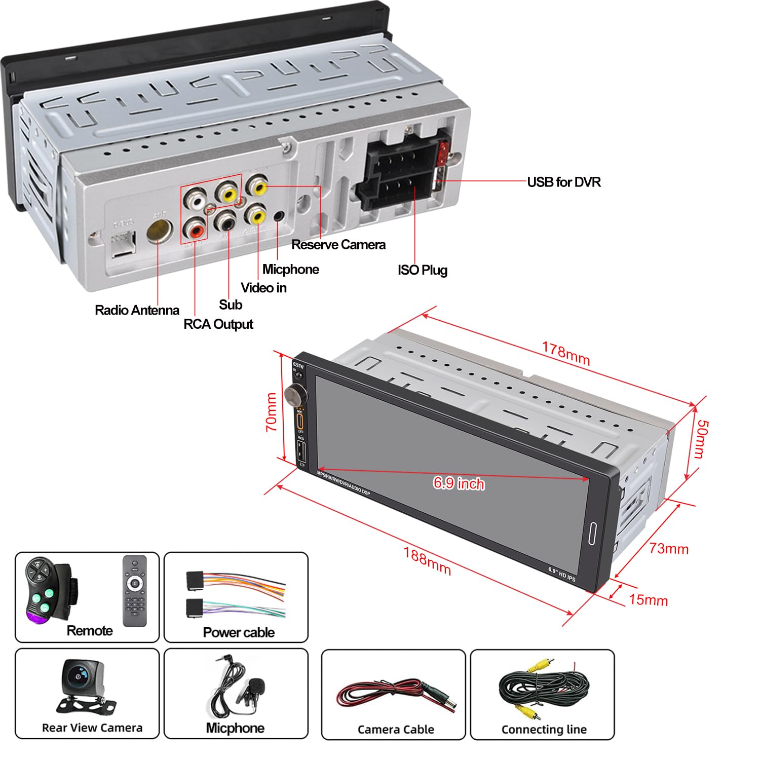 - 【6.9 inch Full HD Touchscreen & support 1080P video playback】 1280*480 High resolution. 6.9 inch LCD Touch screen offers you a fantastic experience to watch HD video. HD 6.9-inch LDC touch screen car stereo with high sensitivity and a full-viewing angle can offer you a brilliant screen-viewing experience even in brightly lit areas. Navigation can display on the screen in HD definition.