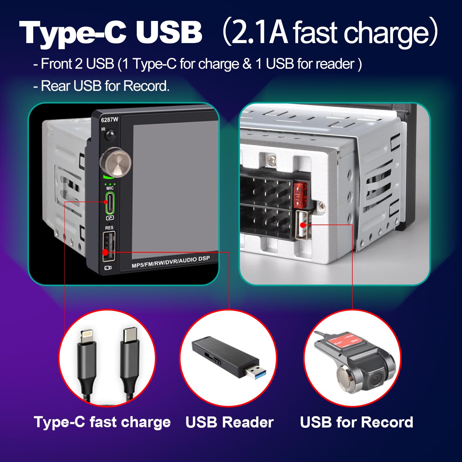- 【Type-C USB for fast charge】2 USB Port ( Front), 1 Type-C for fast charge while the other USB is used for playing music or data transmission.