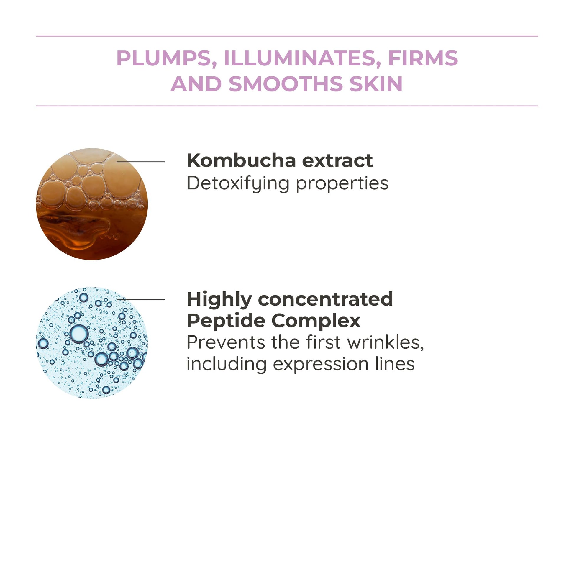 - Unique Ingredients: Infused with Kombucha Extract to combat fatigue and stress, alongside a peptide complex supporting collagen production, diminishing wrinkles.