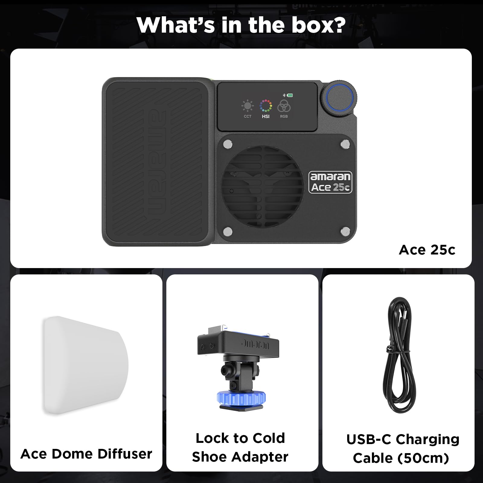 - Lighting Made Easy with Simplified, Custom Controls: The amaran Ace 25c features custom shortcuts that allow you to streamline your creative process by recalling frequently used settings with a double click or long press. Control the light via its user-friendly color screen or wirelessly through the intuitive amaran app designed for content creators.
