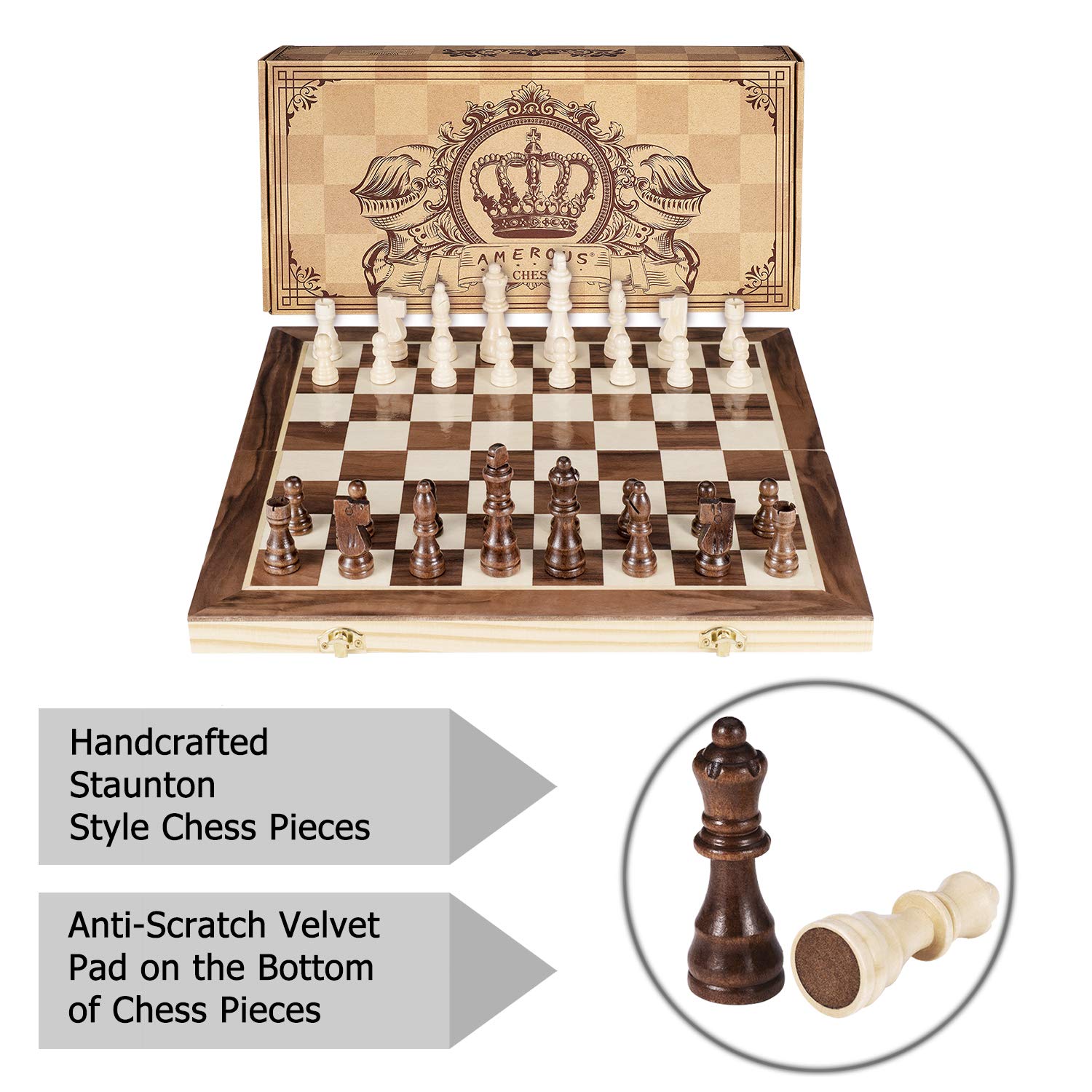 AMEROUS 15 Inches Magnetic Wooden Chess Set - 2 Extra Queens - Folding Board - Pieces Storage Slots, Handmade Portable Travel Chess Game - Beginner Chess Set for Kids, 6 up Age