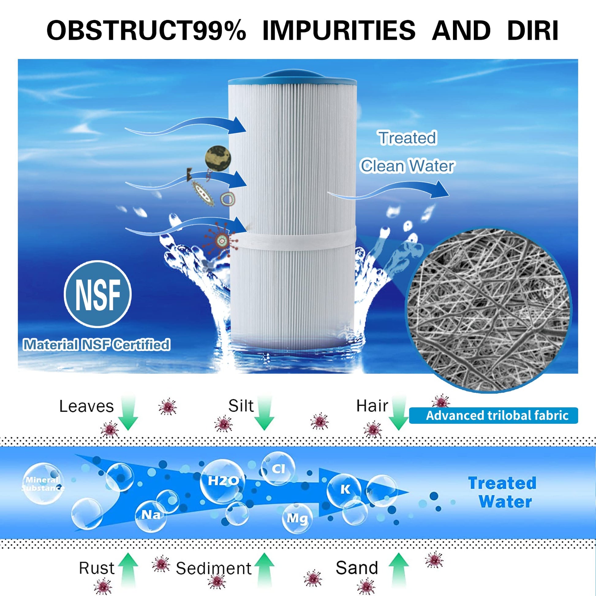 - 【EASY TO CLEAN】The Trilobal Fabric Structure filter material makes it easy to release impurities when cleaning the filter, the filter is like a new one after cleaning. It is recommended that you clean cartridges every 2 weeks to maximize your spa's performance.