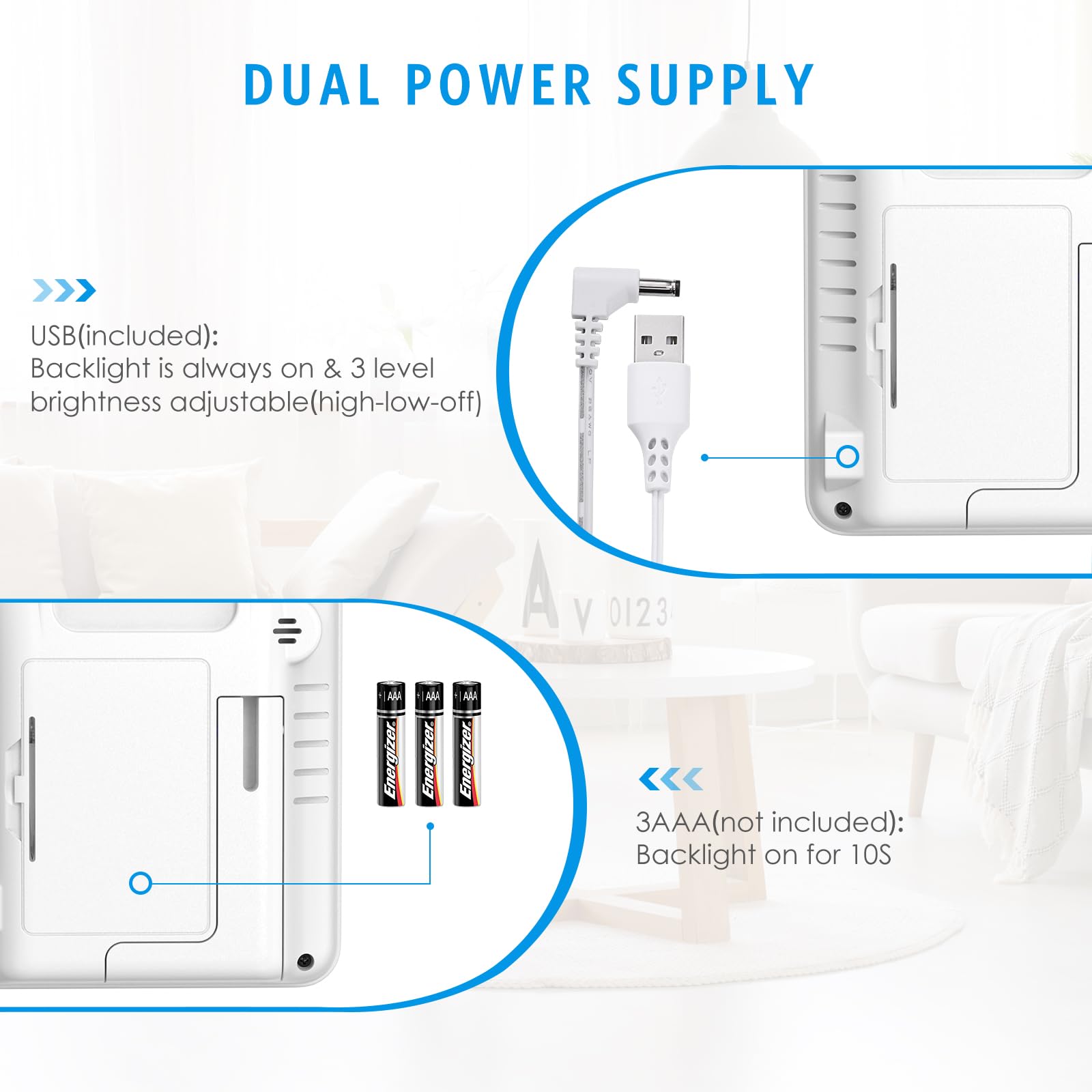 - 🌟USB&BATTERY POWERED, 4.5 INCH DISPLAY & ADJUSTABLE BACKLIGHT - Plug into the USB cable, the backlight will stay on and you can adjust the brightness in 3 levels (high-low-high-low). The display screen is compact and the black bold information is clear and easy to read. Designed for tabletop or wall-mounting, you can place it in a convenient and easily viewable location.