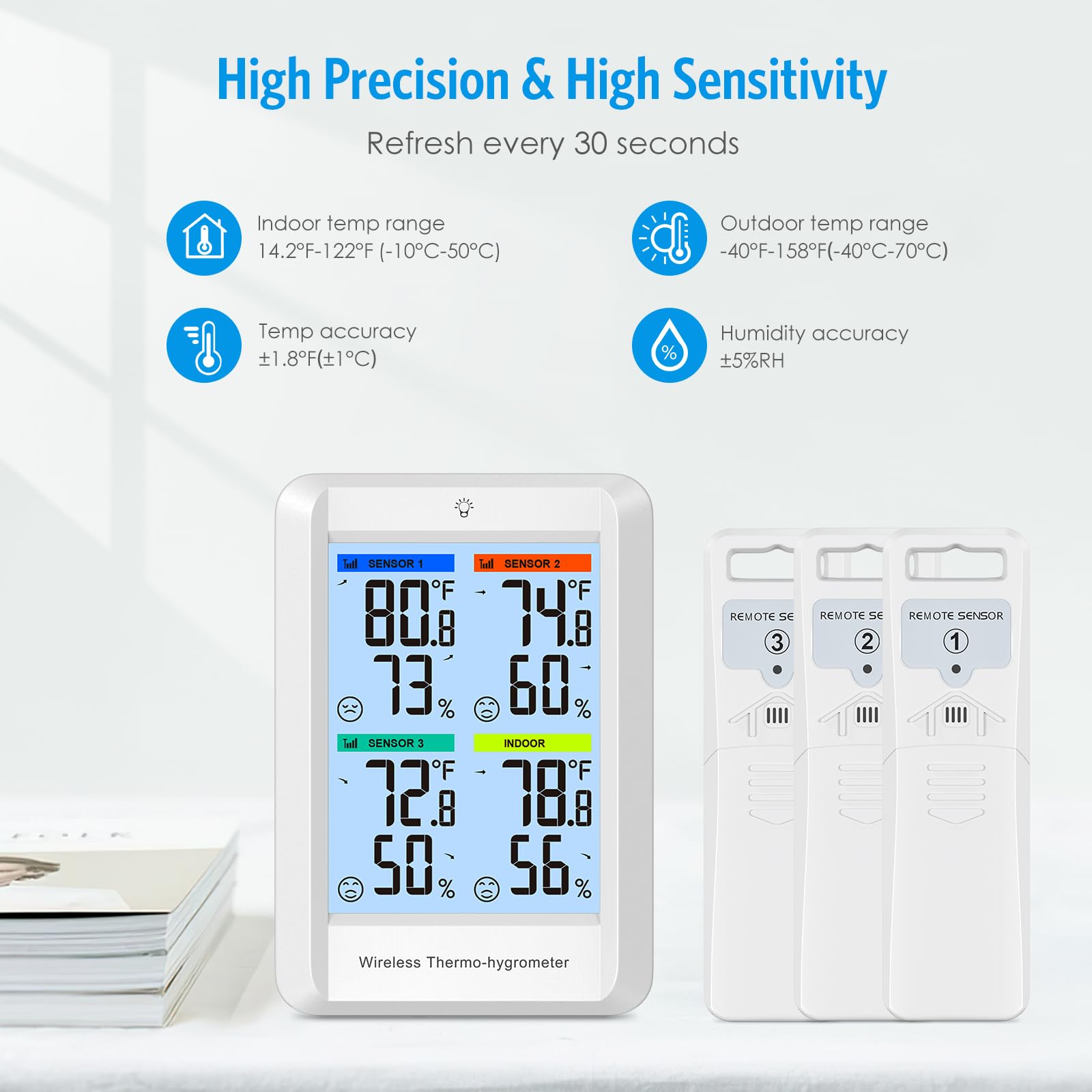 - 🌟HIGH-ACCURARY TEMPERATURE HUMIDITY GAUGE - AMIR indoor outdoor thermometer wireless temperature and humidity monitor is extremely accurate! The indoor temperature range is +14.2ºF to +122ºF (-10℃ to 50℃) and the outdoor temperature range is -40ºF to +158ºF (-40℃ to 70℃) with a temperature accuracy of +/- 0.5°F. Humidity ranges from 1% to 99%, with humidity accuracy of ±5%.