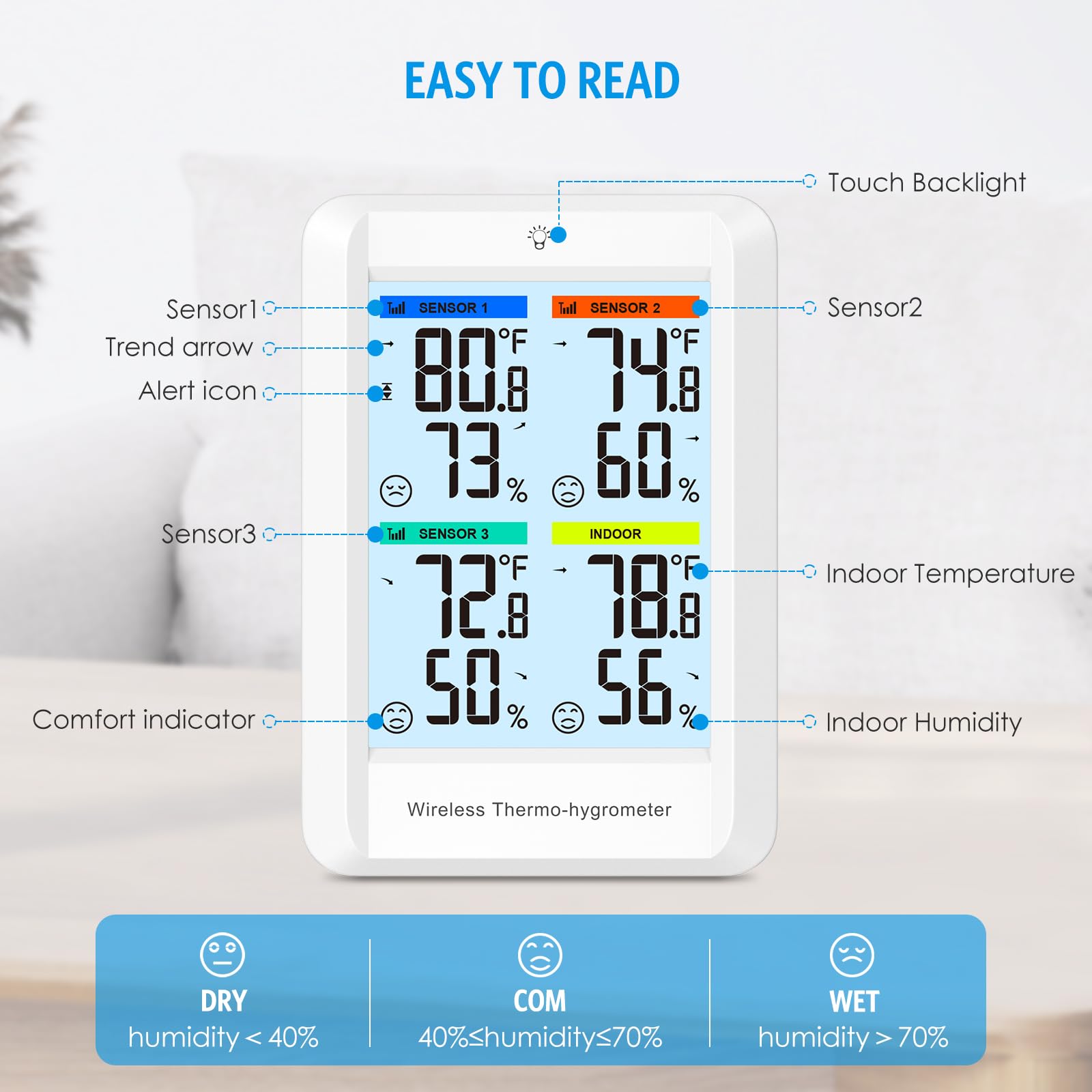 - 🌟MAX/MIN RECORD & TEMP ALERT - The digital indoor outdoor thermometer with multiple remote sensors features MAX/MIN value and alarm functions, and can measure indoor/outdoor temperature and humidity. The MAX/MIN value data is updated every 24 hours and can be switched between ℃ and °F. With the sound alarm, you can manually set the high and low temperature and humidity alert values. An alarm will sound when the values reach the preset maximum or minimum alert thresholds.