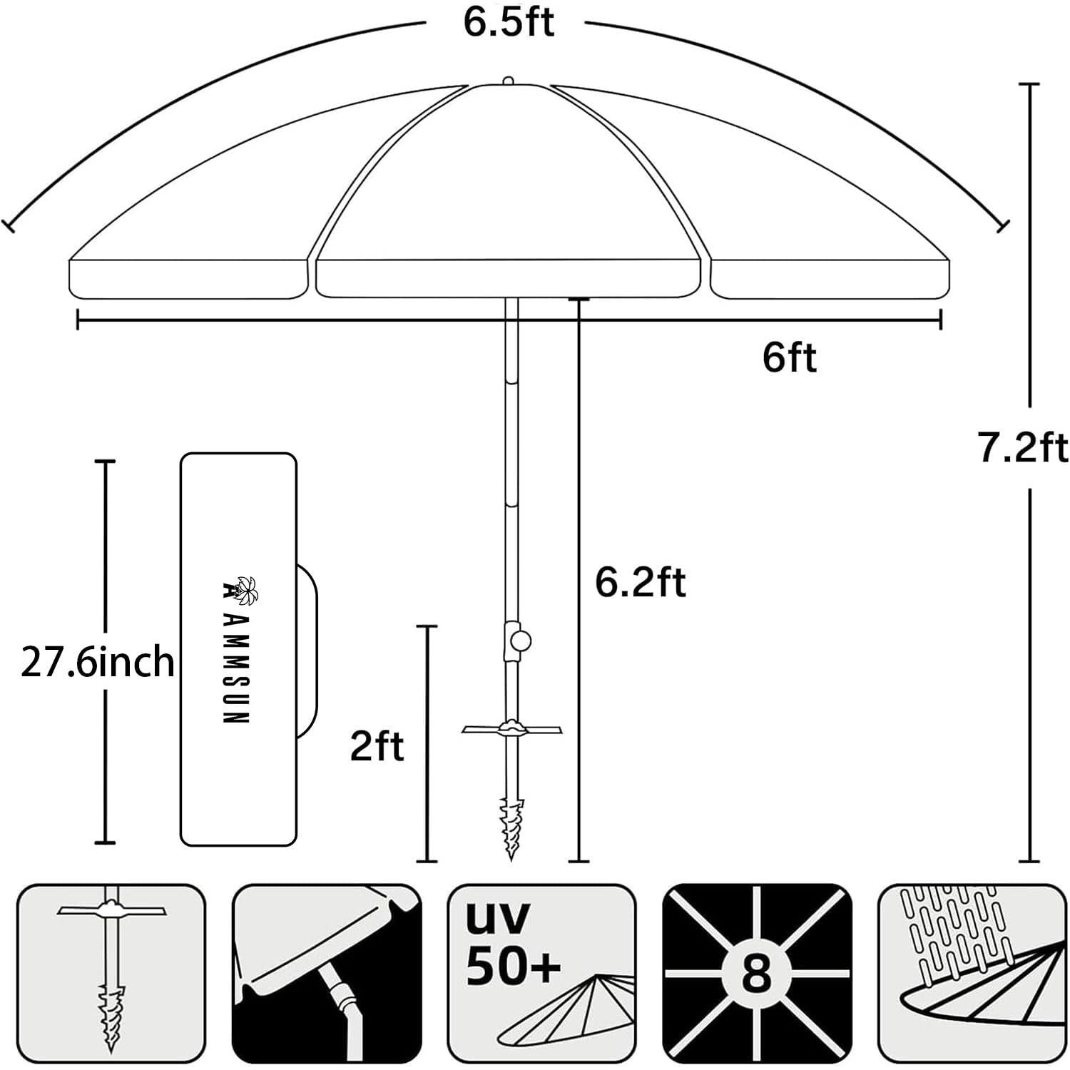 - Air-vented 6.5ft folded beach Umbrella Portable with sand anchor ,The umbrella is supported by 8 fiberglass ribs.with high grade zinc tilt to maximize your shade.