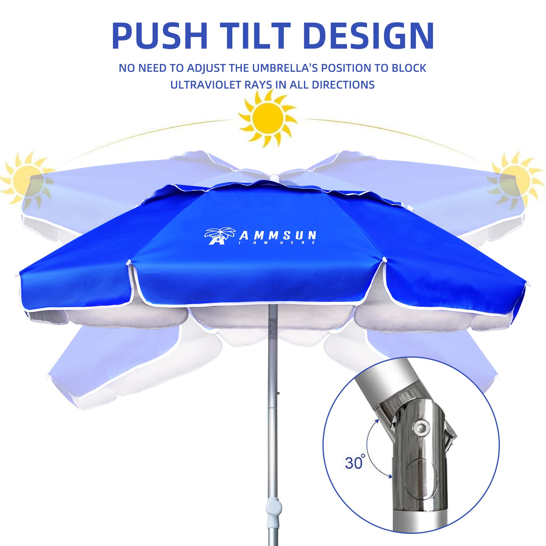 - PUSH BUTTON TILT & AIR VENT DESIGN: The AMMSUN beach umbrella features a two-way tilting mechanism that allows you to adjust the shade and block the sun quickly without moving the beach umbrella, you can enjoy cool shade from sunrise to sunset.Air-vented 6.5ft dia. canopy designed to facilitate air flow for more stability