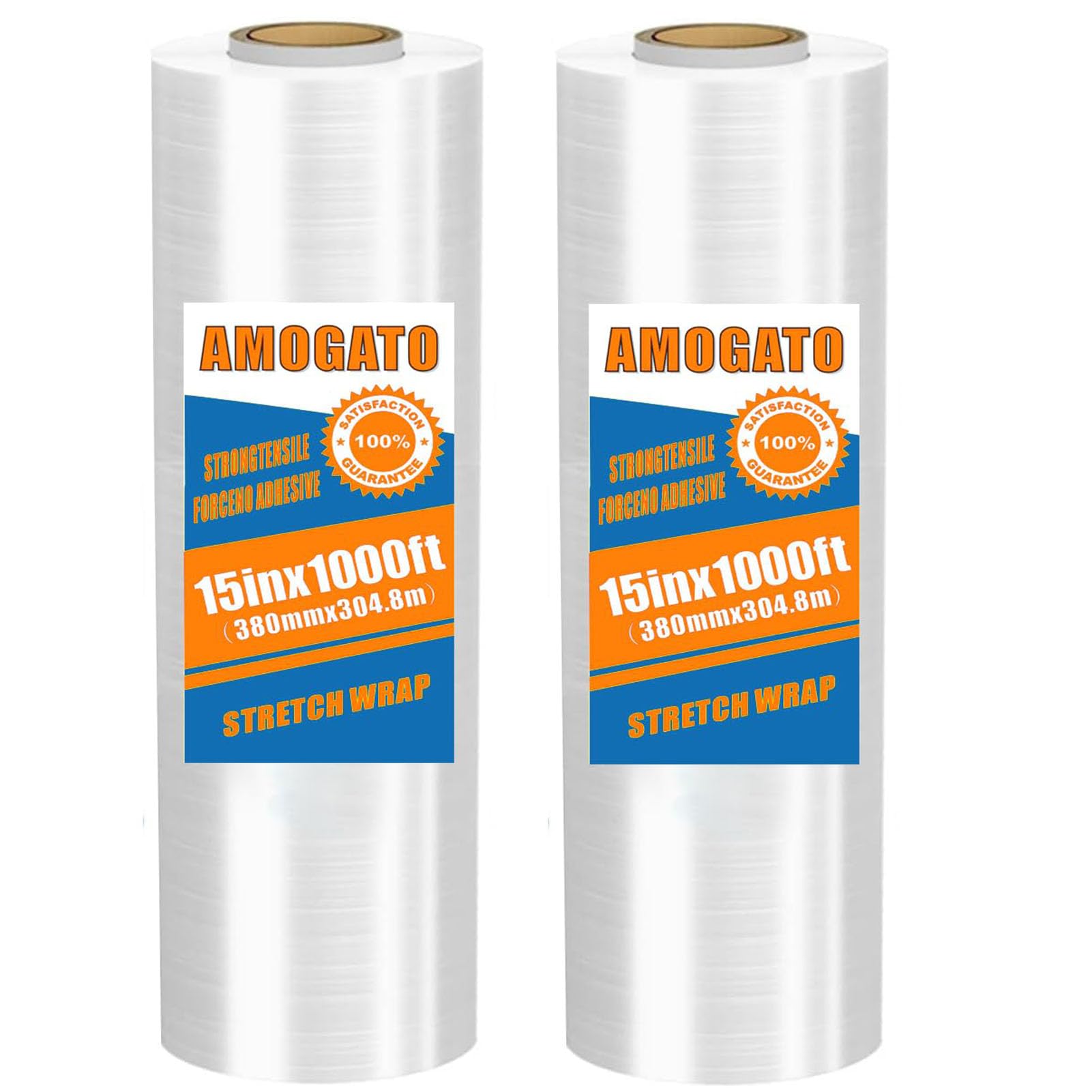 AMOGATO Stretch Film for Moving and Packaging - Strong, Residue-Free, Easy to Use with Blue Handles,60 Gauge, 2 Pack Clear 15 Inch x 1000 Feet