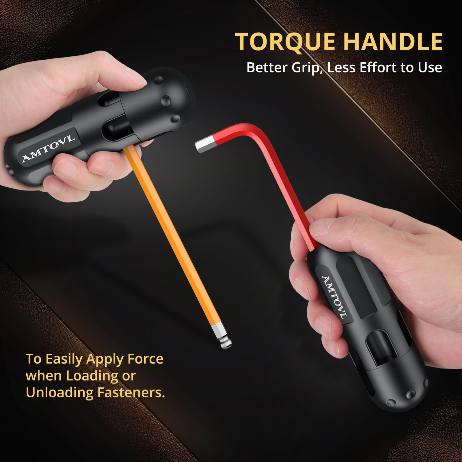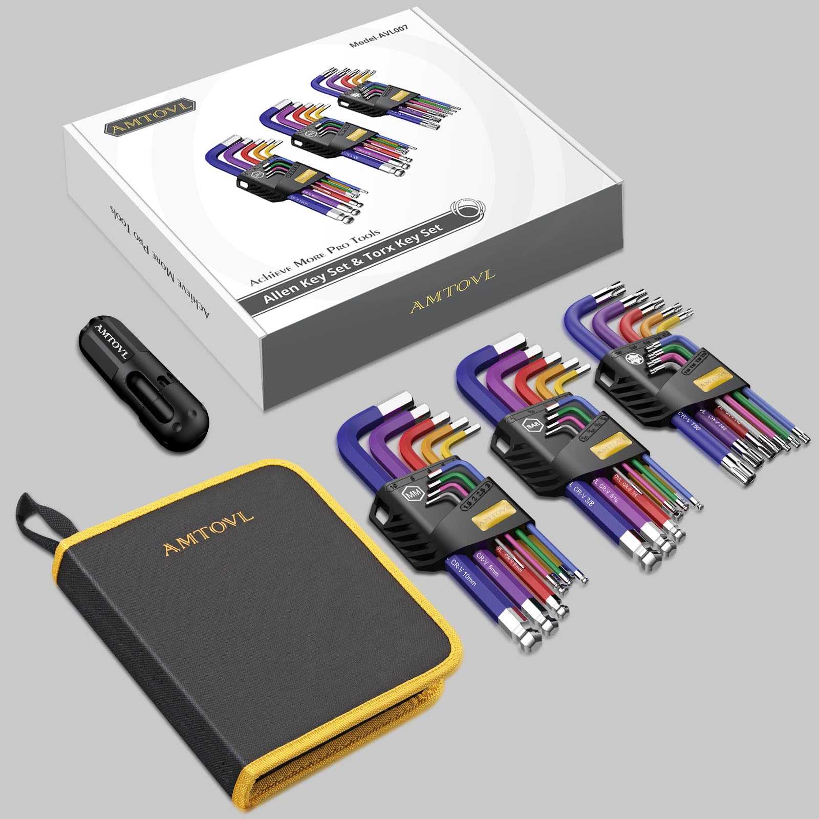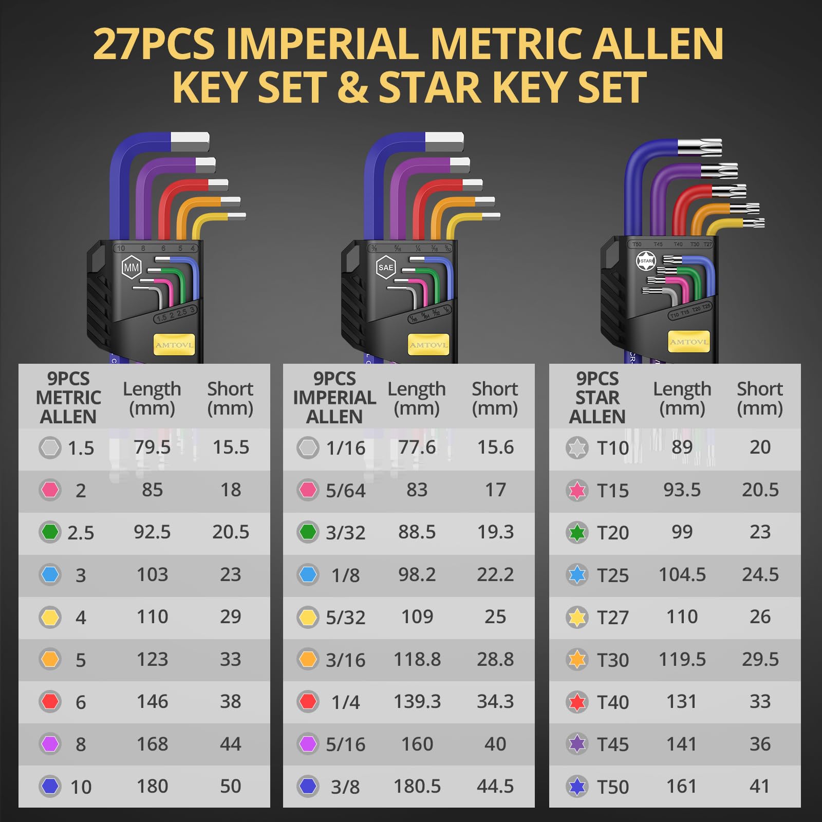 AMTOVL 27PCS Allen Key Set - Metric & SAE Allen Wrench Set, Extra Long Ball & Star End Hex Keys with T-Handle & Color Coding for Bicycle, Household DIY