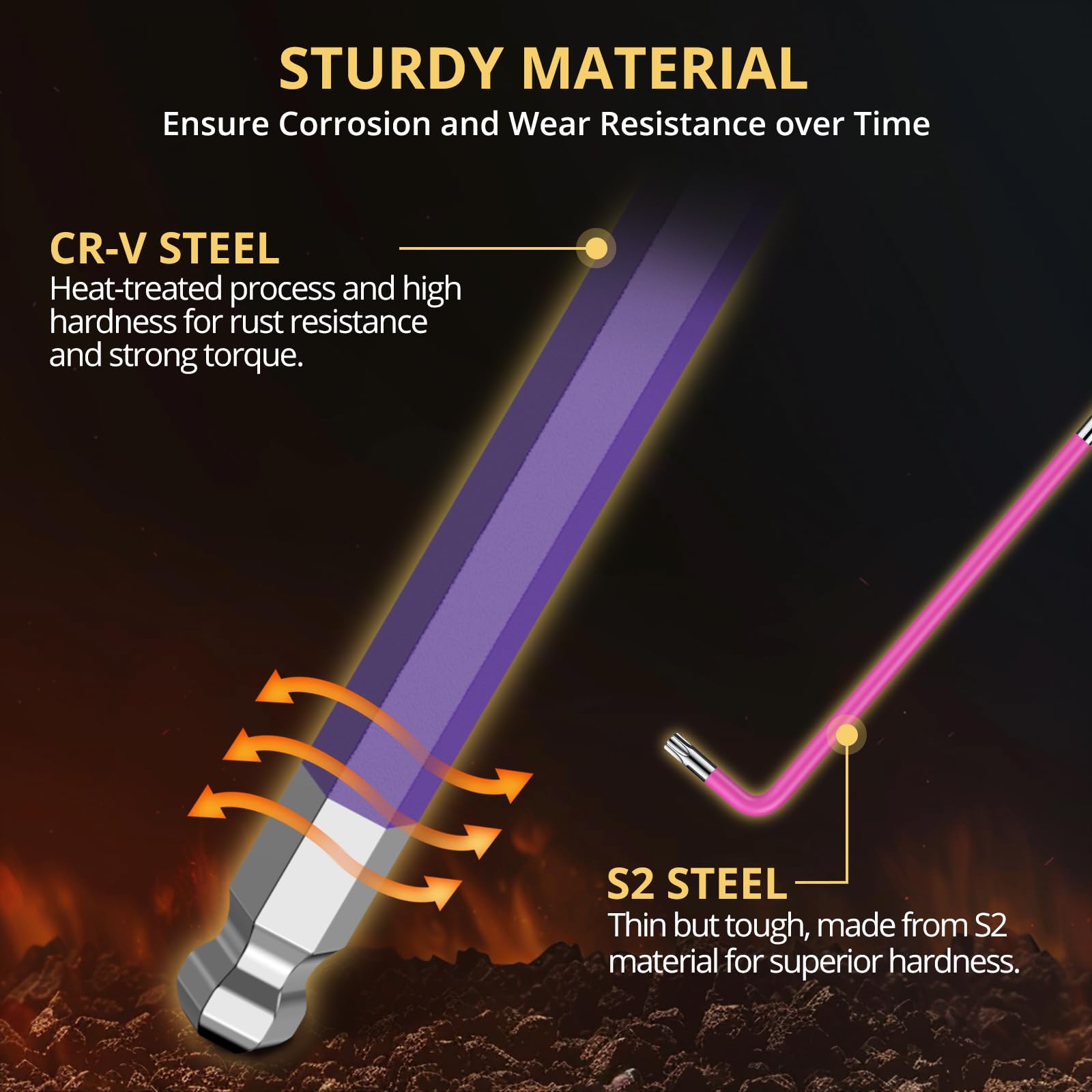 - 【Sturdy Allen Wrench Set】Crafted from hardened, heat-treated CRV and S2 for durability, this SAE/Metric/Star hex key set features a long/short arm design for extended reach and extra leverage, perfect for deep spots and tight fasteners