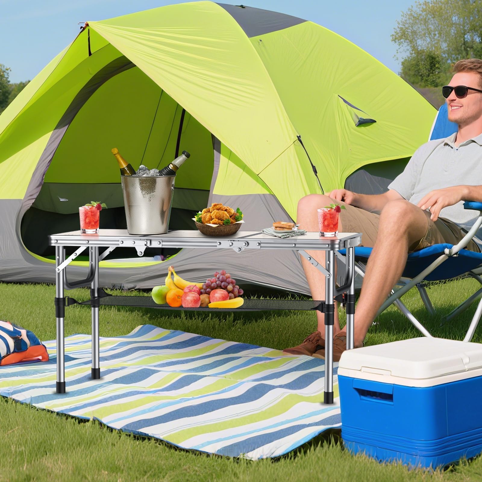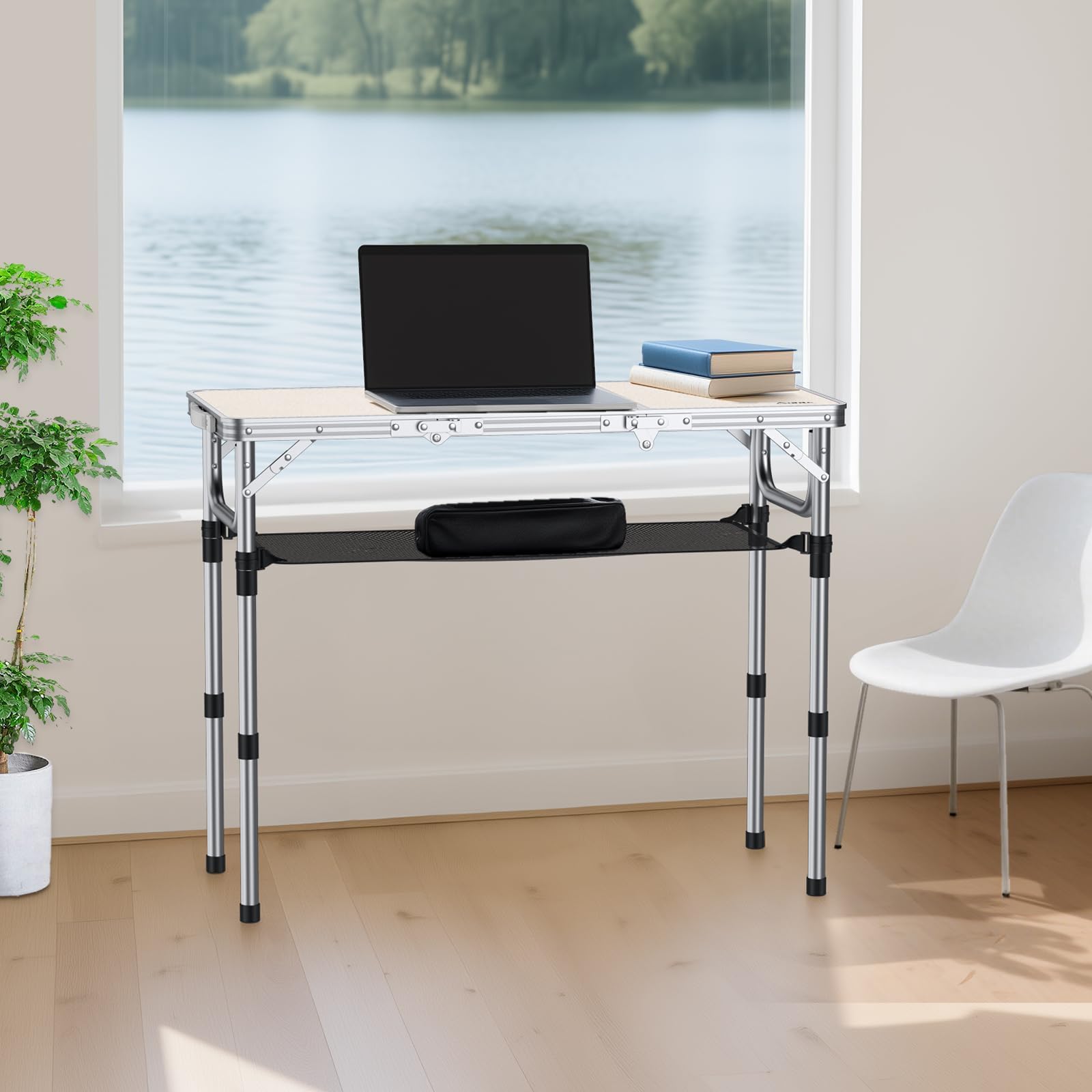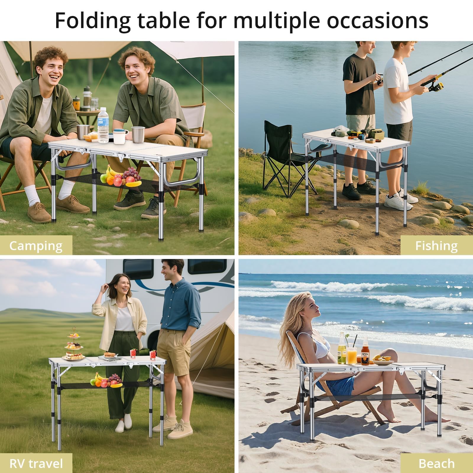 Anbte Camping Table, Camping Folding Table Aluminum Folding Table with 3 Adjustable Height Max 27.1 inch Portable Picnic Table with Storage Net and Bag for Outdoor, Backyard, 34.6" X 16", Silver