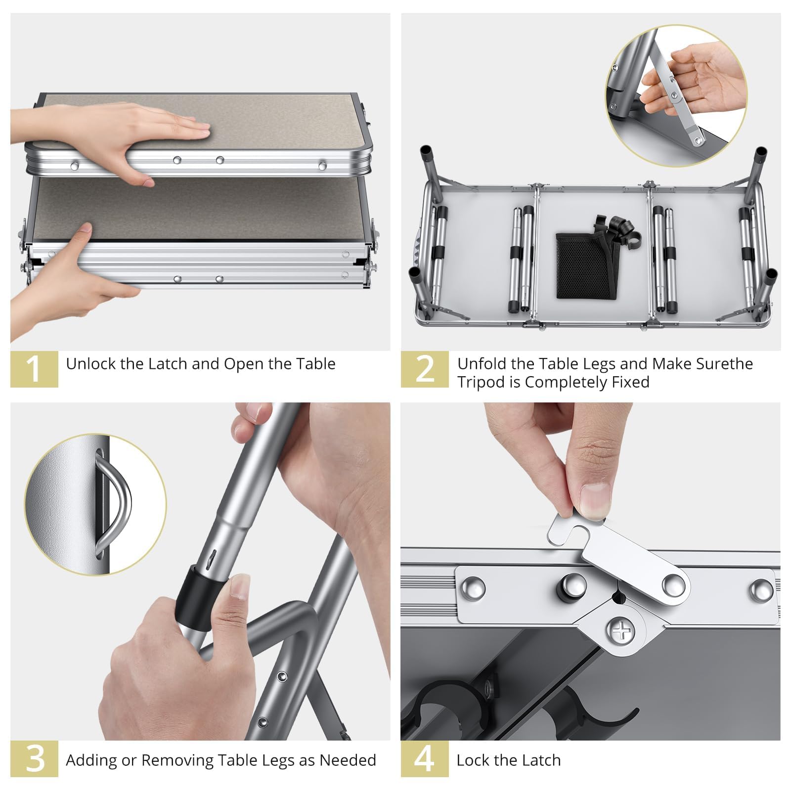 - Portable & Easy to Install: This foldable table includes a storage net for a variety of small items. And comes with a convenient carrying handle, very portable. Set up within 1 minute and folds up into a briefcase sized package for easy transport and space-saving, great to store in your car, RV, river rafts, motorcycle rear seats