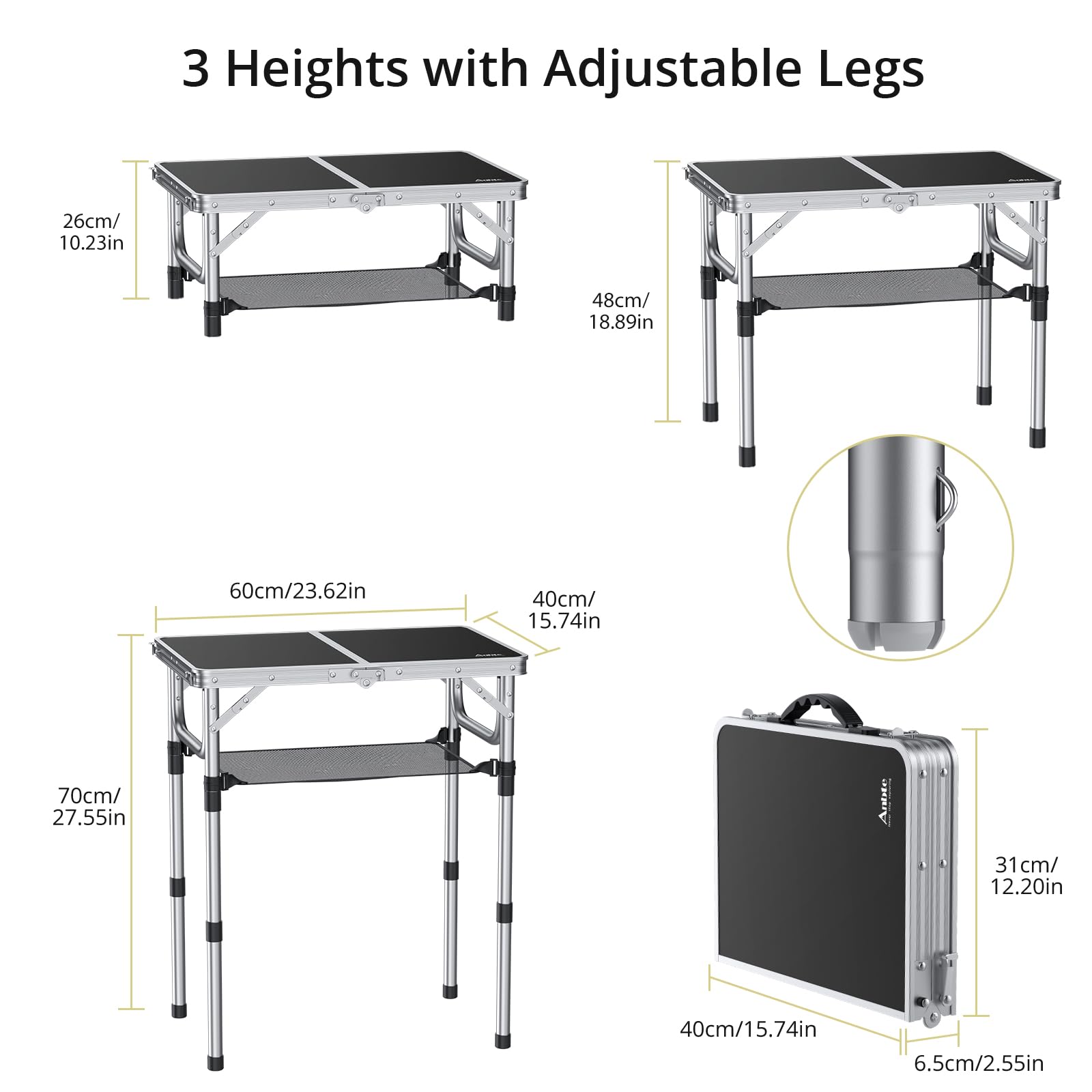 Anbte Folding Camping Table with Storage Net, 3 Adjustable Heights Aluminum Outdoor Tables, Lightweight, Waterproof, for Outdoor Indoor Picnic Beach Kitchen Picnic Backyard, 24" x 16", Black
