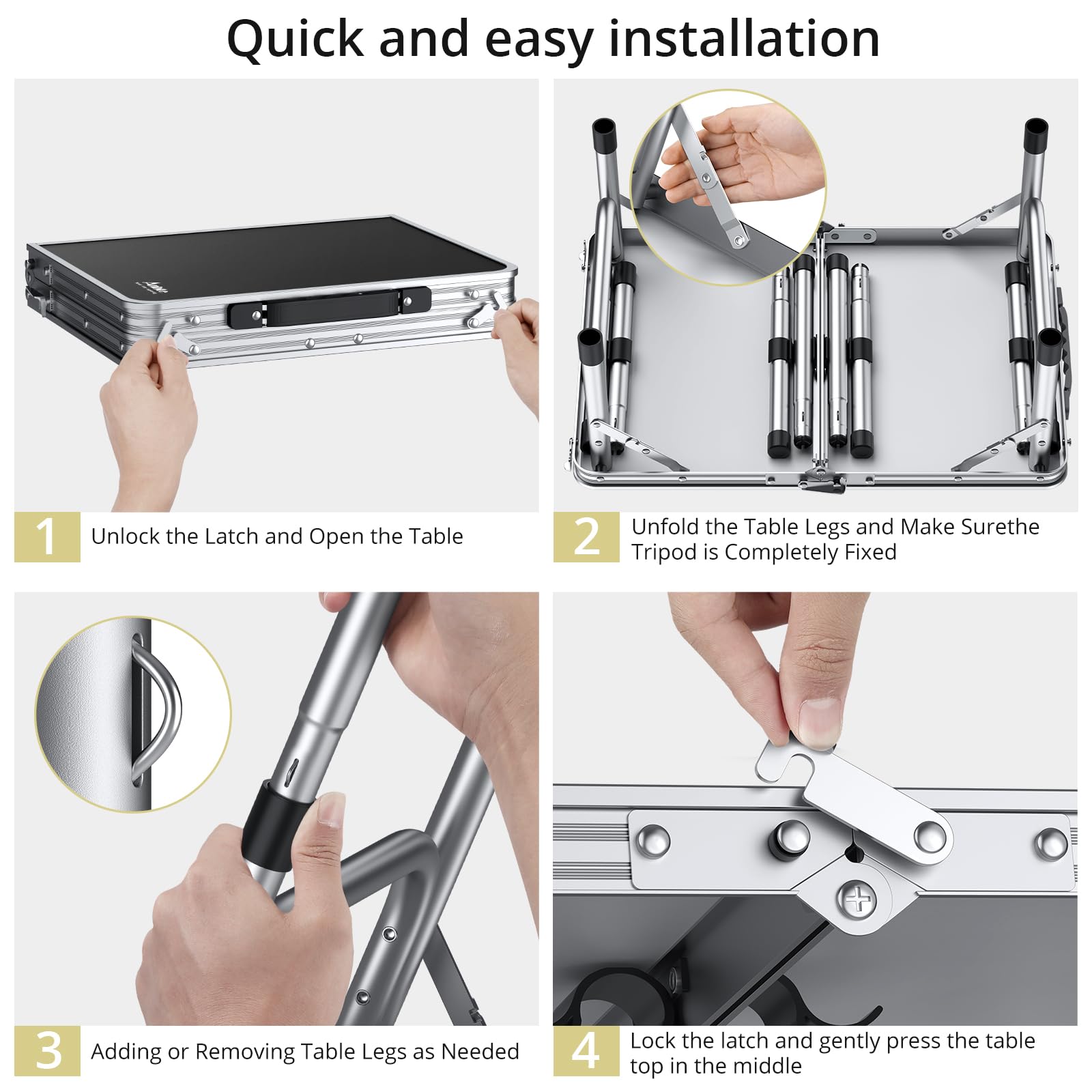 - Stability & Easy to Clean: The entire frame of the camping table is made of thicker aluminum alloy, which is very solid and durable. MDF (Medium Density Fiberboard) tabletop is smooth and easy to clean. This allows any spills or messes to be cleaned easily