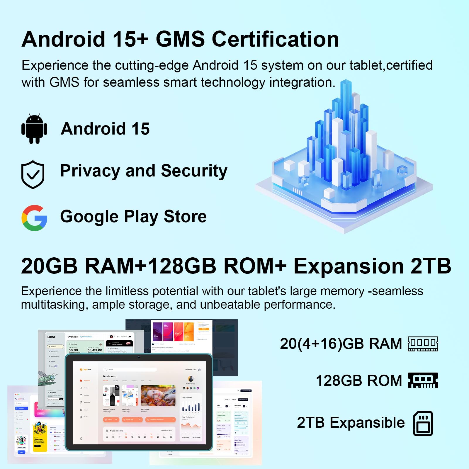 - 【18GB RAM+128GB ROM+2TB Expandable】 The Android 15 tablet PC built-in a powerful storage combination of 18GB RAM (6GB+12GB achieved through expansion technology) and 128GB ROM, comes with new generation ultra-high performance and low power consumption 2.0GHz CPU, achieve faster and more stable running and storage speeds. In addition, it can be expanded up to 2TB with a microSD card (card not included) for even more storage.