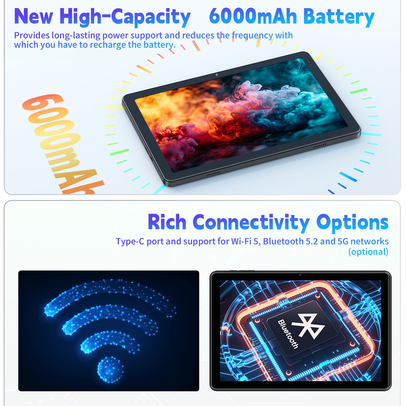 - ★Wi-Fi 5+Bluetooth 5.2+5MP+8MP★ Featuring 5th generation Wi-Fi technology, this Android tablet supports 5G and 2.4G dual-band Wi-Fi, searching for networks quickly and freely to provide a better internet connection with low latency, strong signal and fast speed. It also comes with a clear 5MP front camera and 8MP rear camera for your daily needs, providing you with great photos and clear video chats.