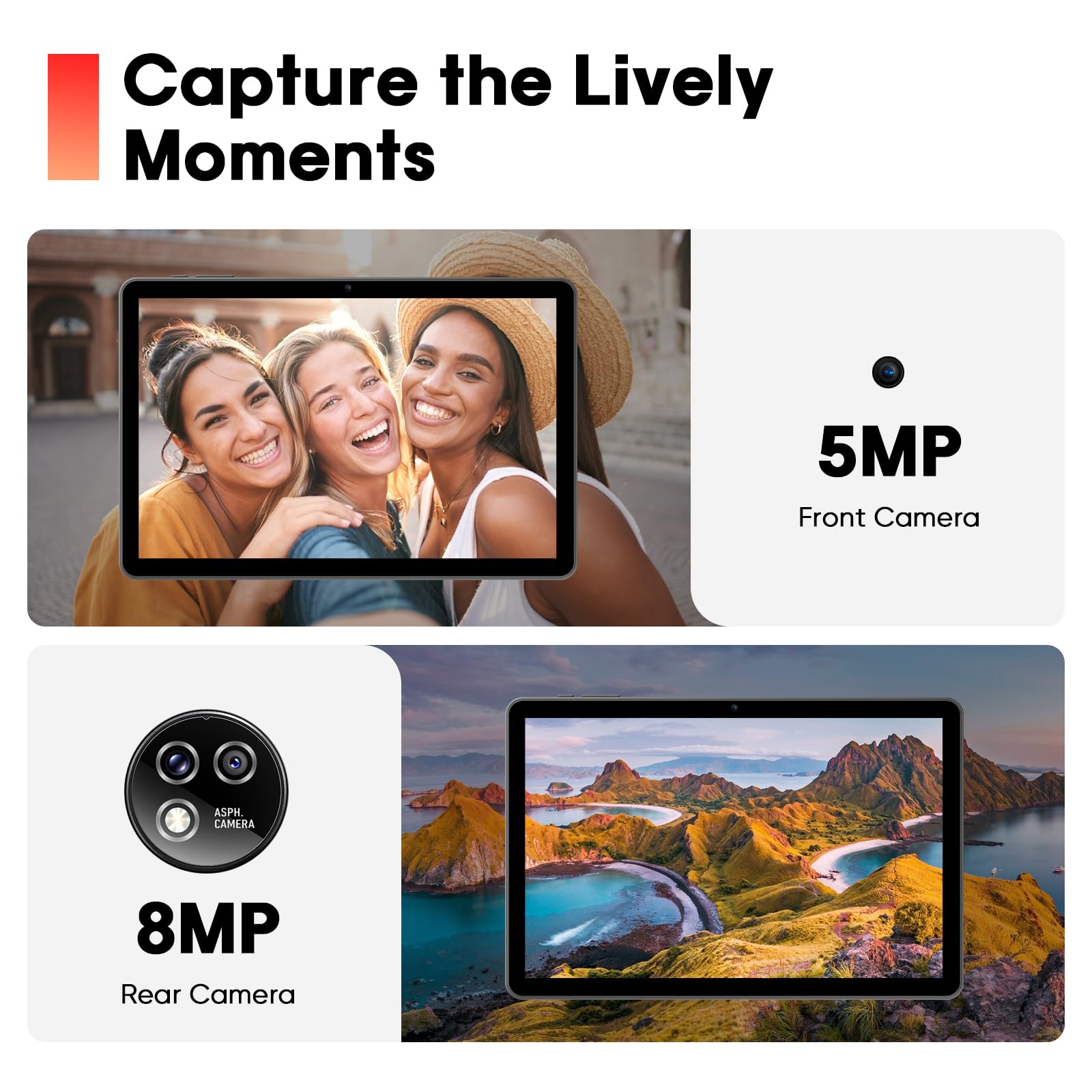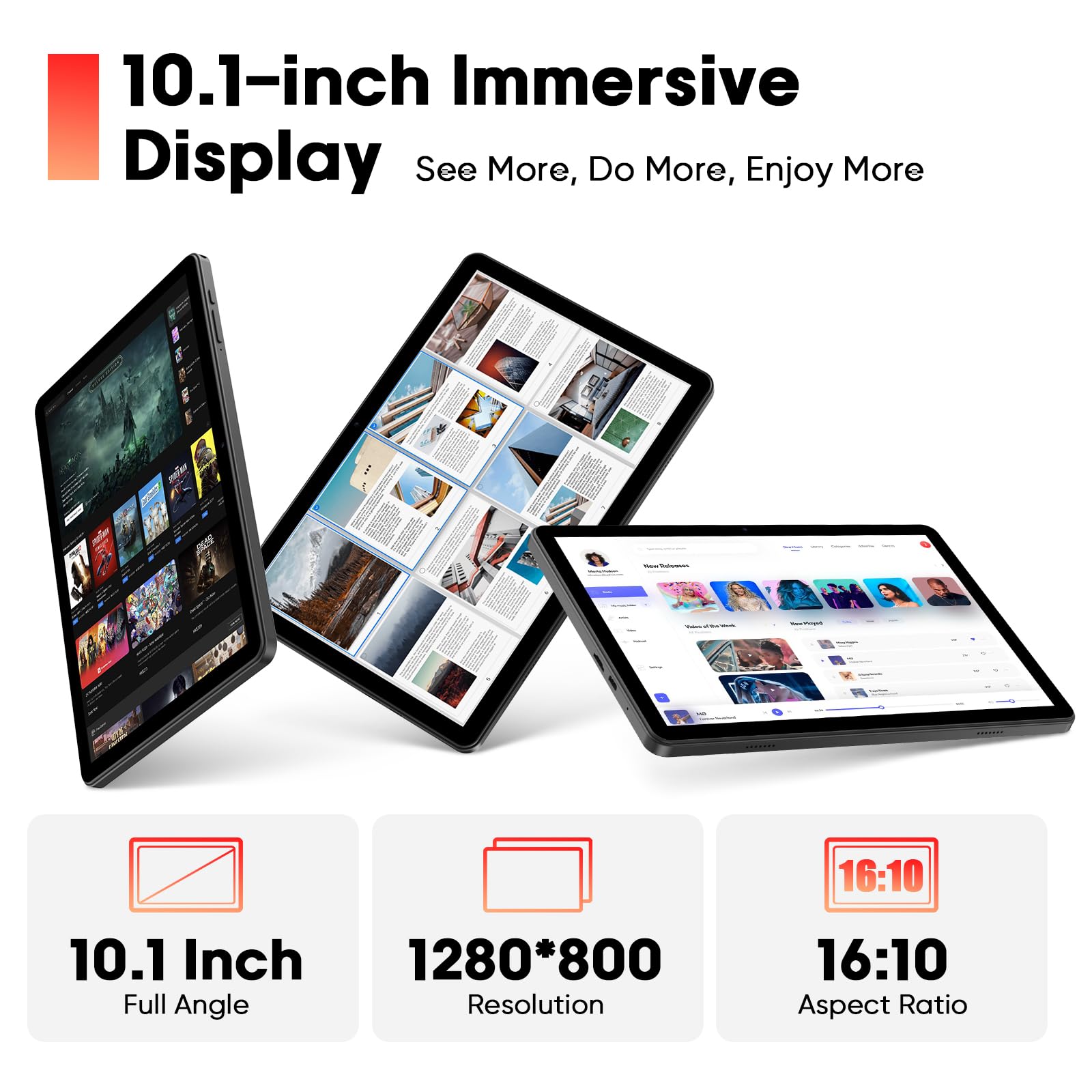 - [10.1 Inch Display + Widevine L1] The tablet with a 10.1 inch 1280*800 IPS display, providing a realistic visual experience with clear details. Using IPS Incell fully laminated display technology, the screen is clearer, richer in color, and also provides a wider viewing angle. Effectively filters harmful blue light, reduces eye fatigue and irritation, and protects your vision health.