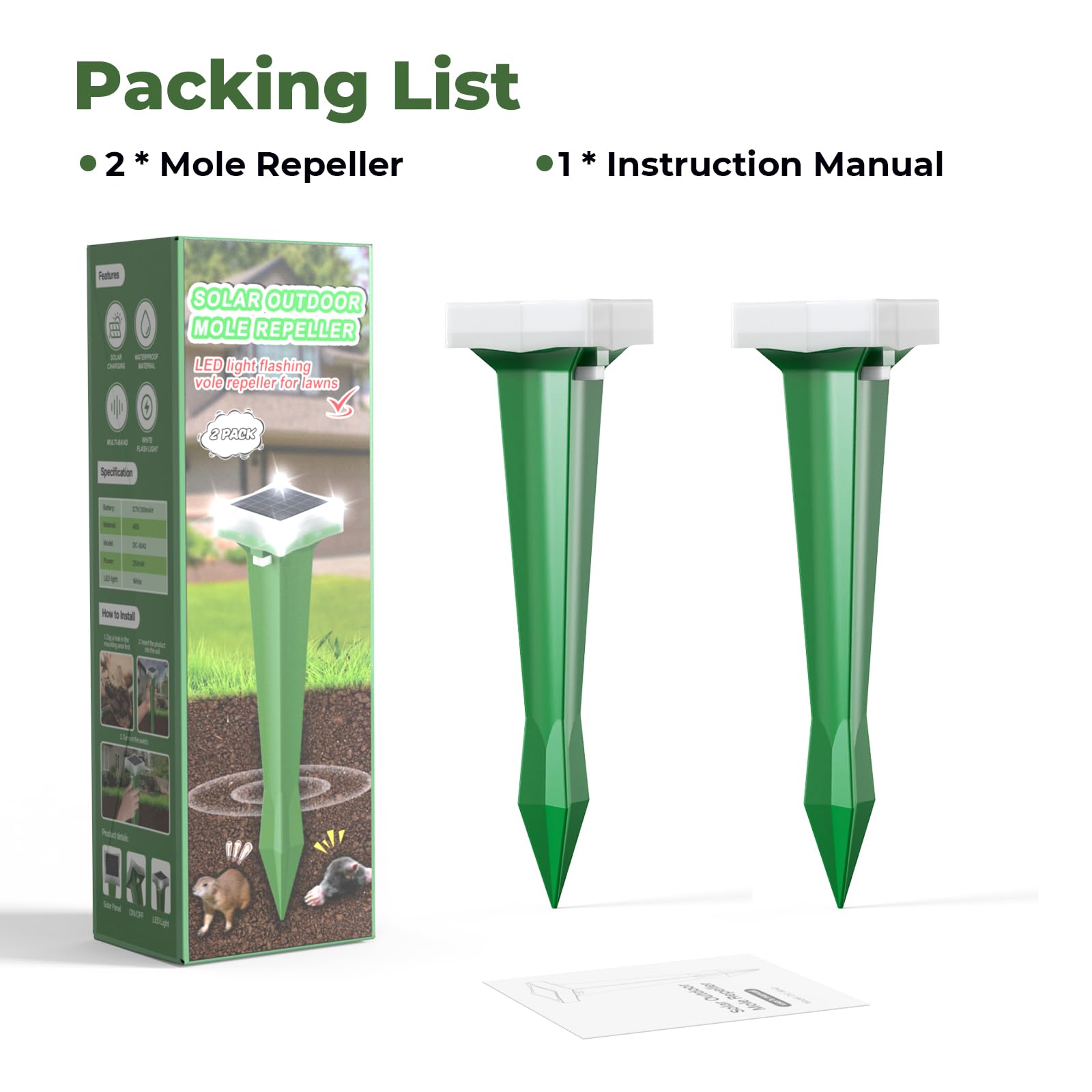 - 【Safe Mole Repeller】:This repellent device adopts a humane approach to rodent deterrence, it is a safe and poison-free way to get rid of moles, voles, gophers, mice, and other burrowing rodents. Compared with those expensive and dangerous chemicals and tools, it is safer. No need to worry about your pets and family.