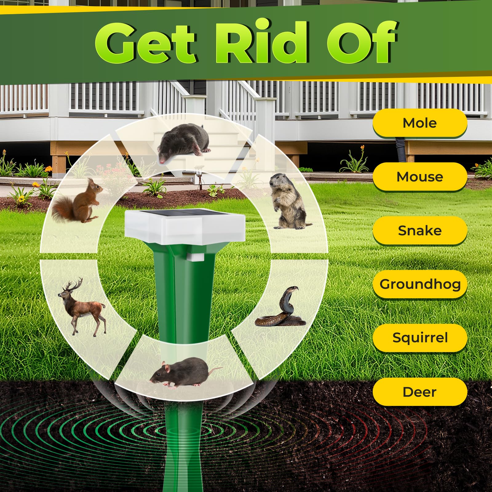 - 【Effective Mole Repeller】The animal deterrent devices emit a sound of 400 Hz and penetrate the soil every 20 seconds, which highly irritating the moles, snakes, gophers, voles, and underground burrowing rodents to keep them away from the coverage area.