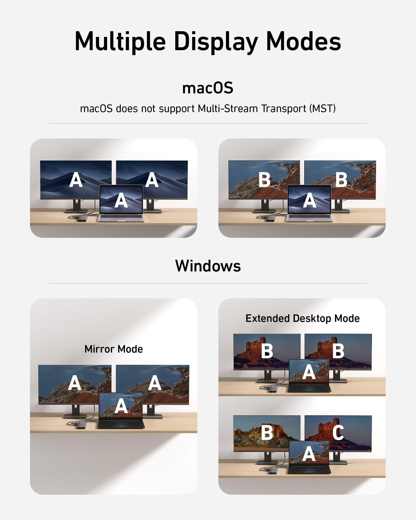 - Multi-Monitor Display: Connect to the DisplayPort and HDMI port to enjoy crystal-clear streaming or mirroring across 2 displays at up to 2K@60Hz with a DP 1.4 laptop or 1080p@60Hz with a DP 1.2 laptop. Note: For macOS, the display on both external monitors will be identical.