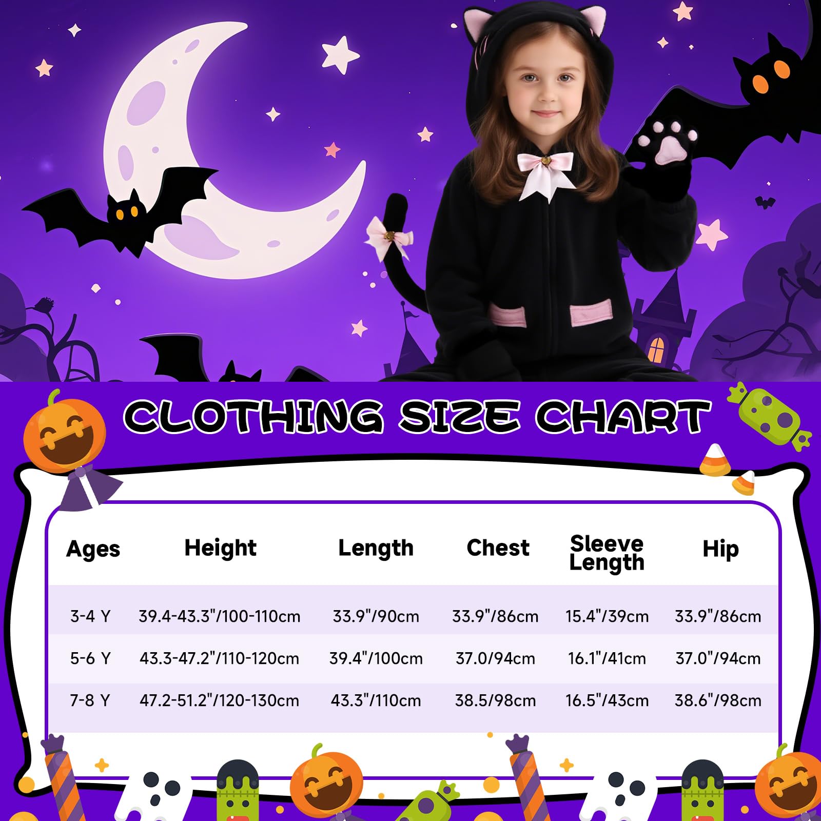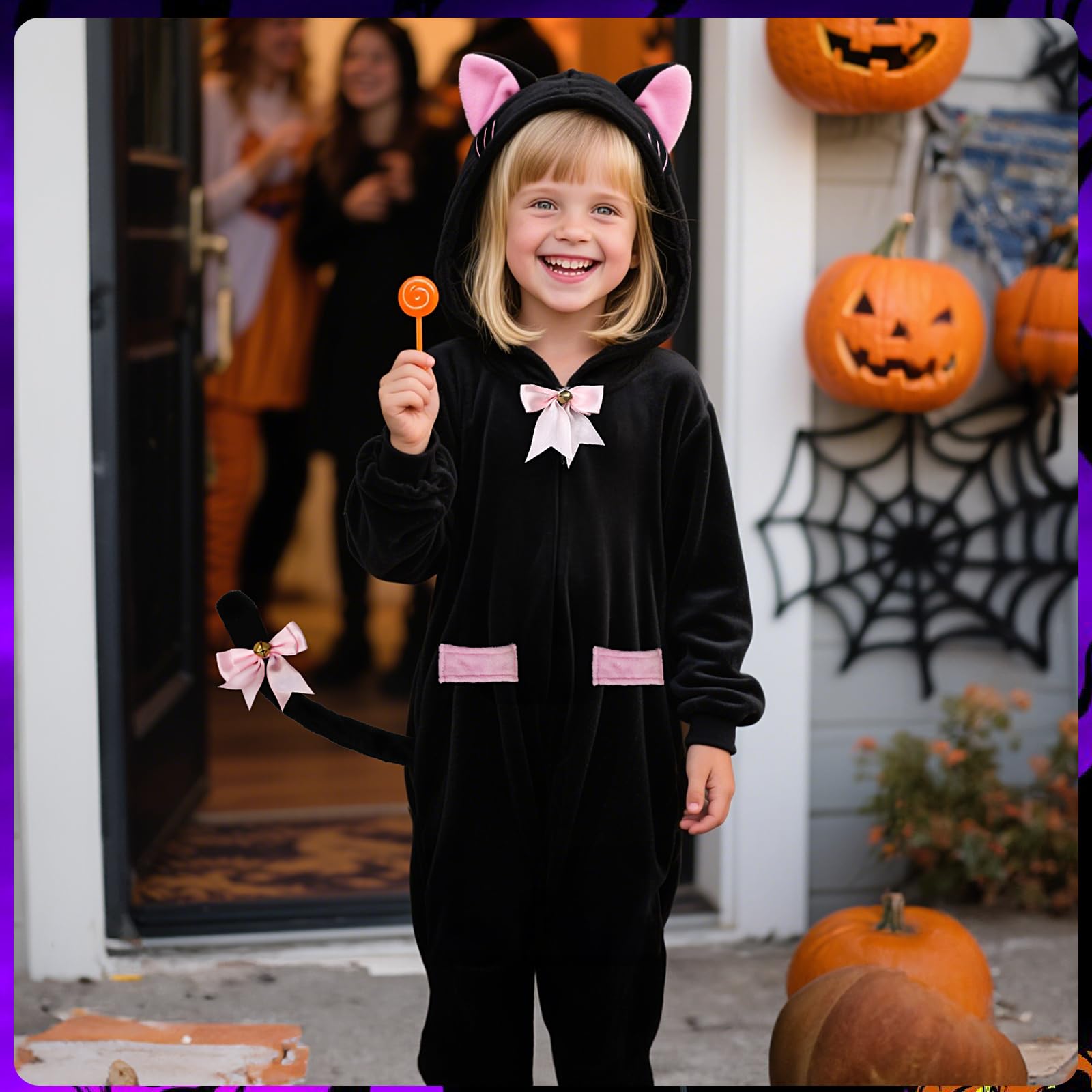- Charming Black Cat Costume for Girls – This adorable black cat costume for girls features a cute cat ear hood, soft tail, and bell bows on the collar and tail. It's a magical cat costume for girls that makes every moment special.