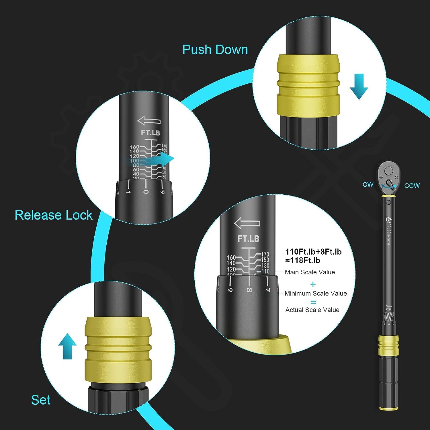 - 【High Accuracy】This torque wrench 1/2 drive features precise dual scales of 10-170 Ft-Lb/13.6-230.5 Nm. Each torque wrench is shipped pre-calibration tested for accuracy to ISO 6789, GB/T15729 and ASME B107.14M requirements. It tests for accuracy to industry standards within ±3%.
