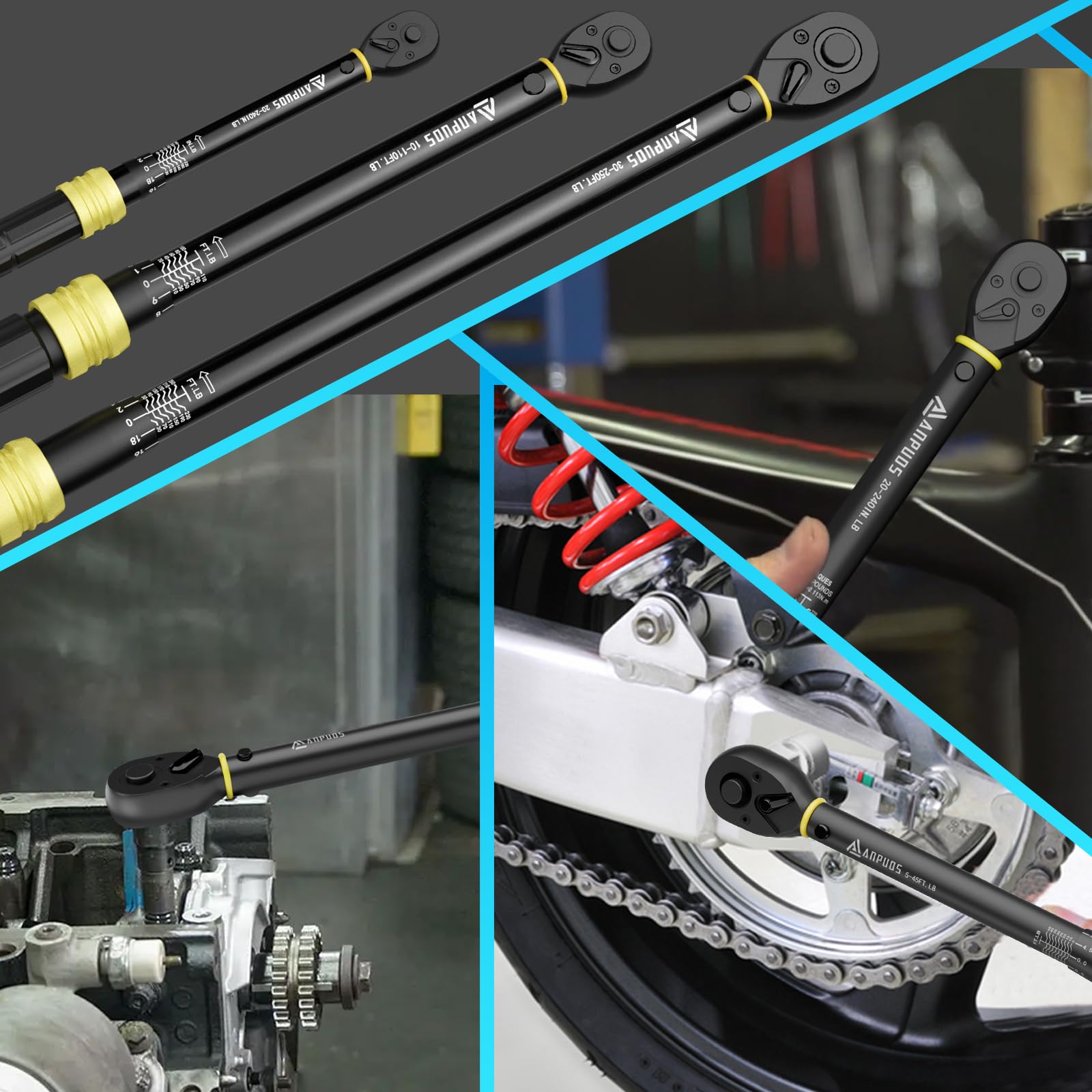ANPUDS 1/4 3/8 1/2-inch Drive Torque Wrench, 5 Pcs Click Torque Wrench Set, 20-240in.lb, 10-110+30-250Ft.lb with 2 Adapters, Dual-Direction, 72-Tooth, Dual Range Scales for Bike, Motorcycle, Car