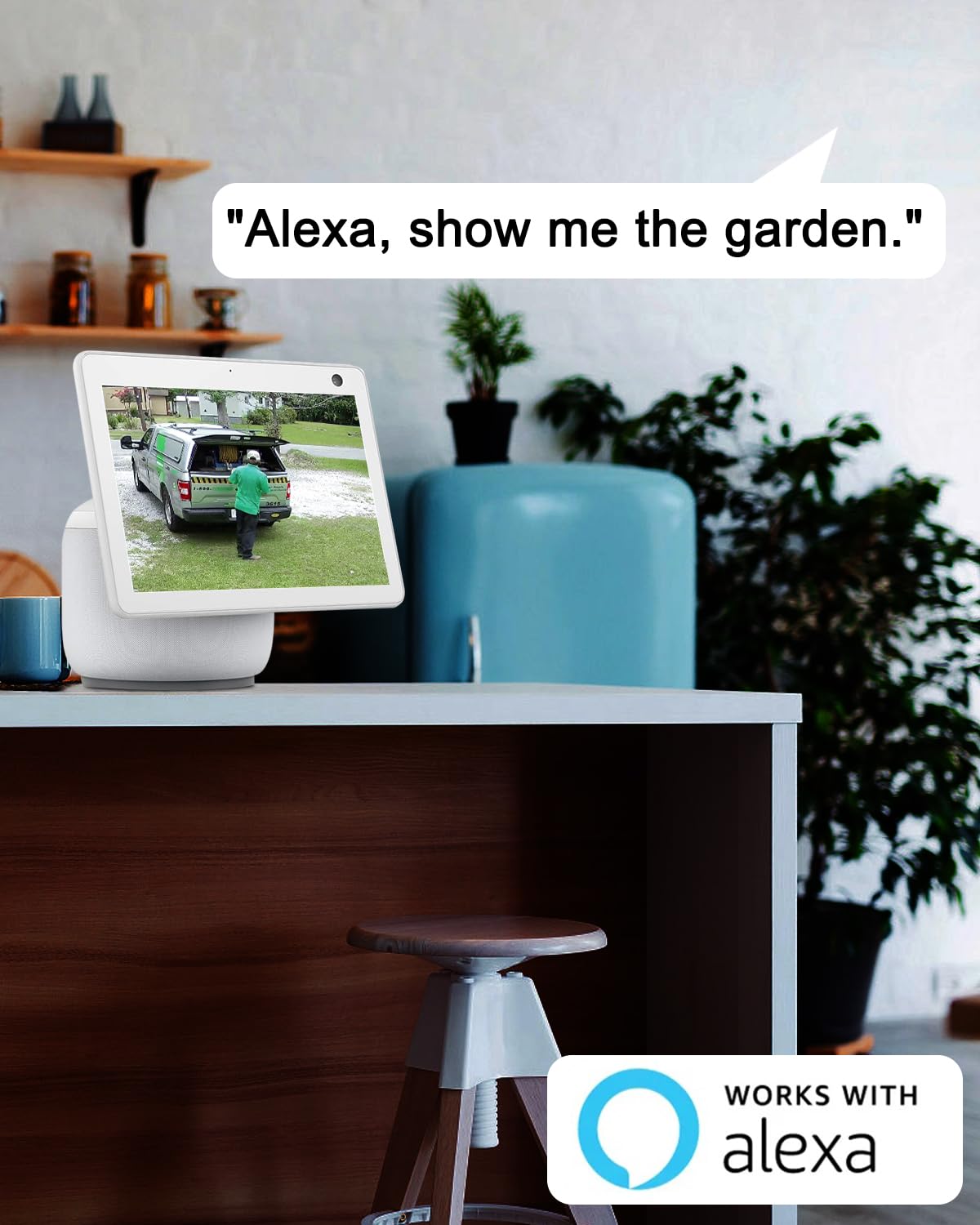 - Embedded Solar Panel & Alexa Compatible: Don't be bothered by complicated wires, you can quickly install your security cameras wireless outdoor at any time. Installed once for permanent use. The Embedded solar panel converts solar energy more efficiently for 365 days of uninterrupted work. If you're connected to Alexa, you can always ask it to show you outdoor security camera footage