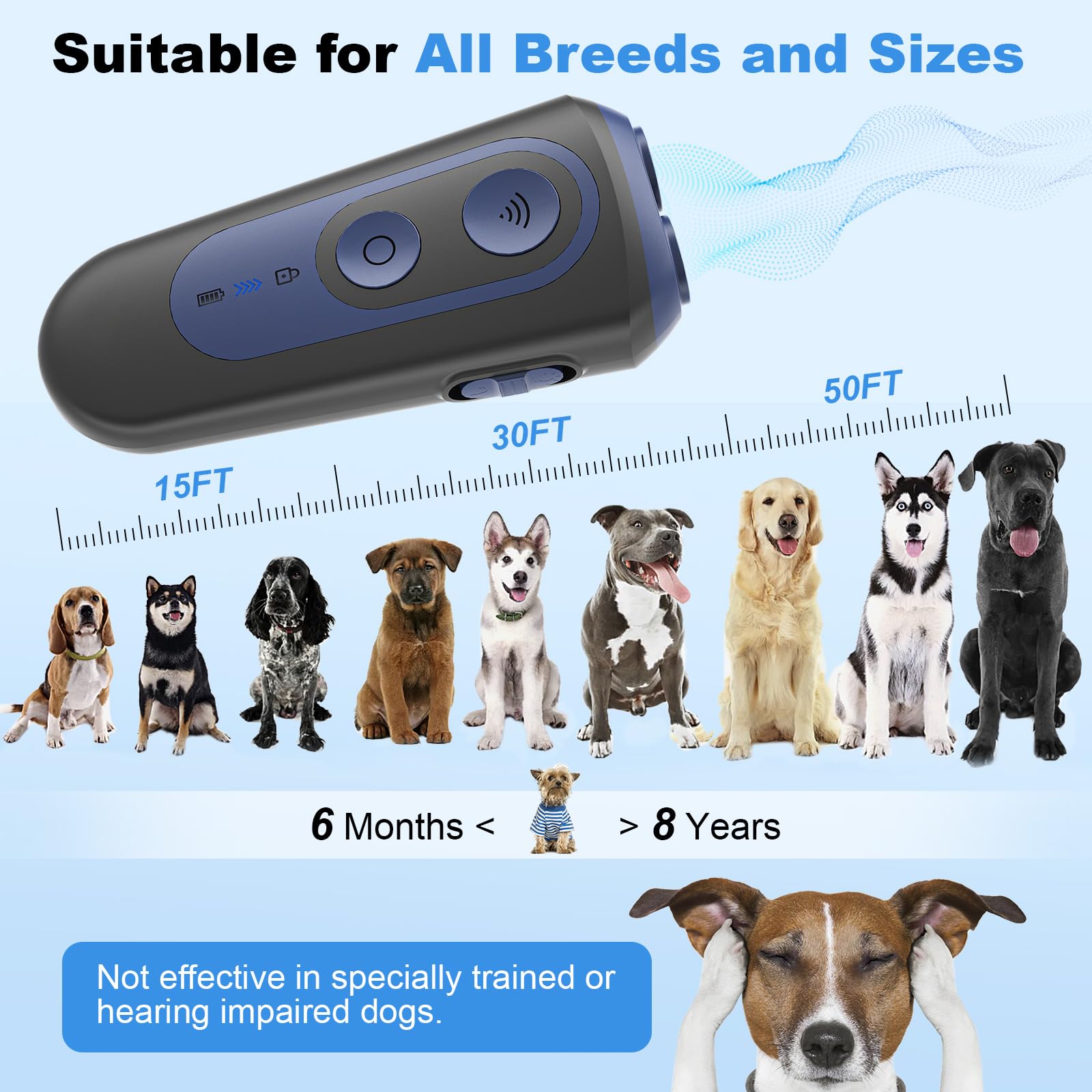 - Powerful Dog Barking Deterrent Devices with Dual Emitters: Unlike ordinary bark deterrents, this anti barking device for dogs uses two enhanced ultrasonic emitters to deliver stronger sound waves. With Normal and Dynamic modes, this dog barking deterrent device effectively stops excessive barking, digging, chewing, and more up to 50Ft away.