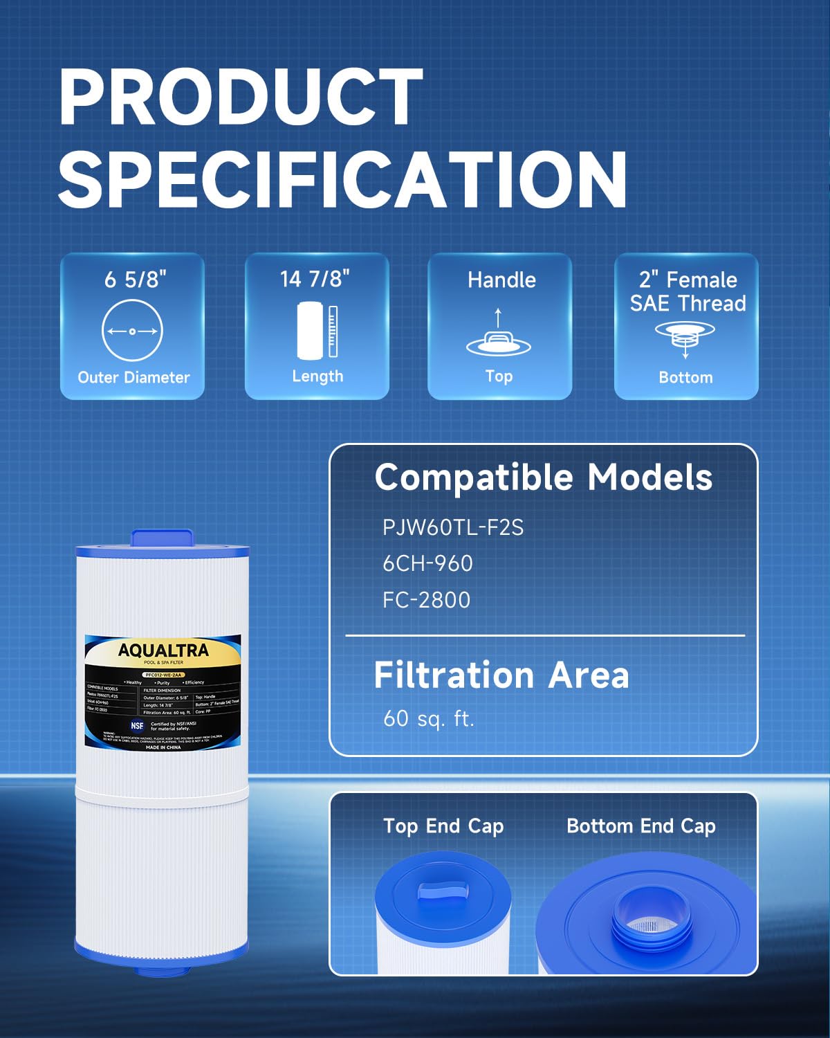 - 💧【Compatible Models】Outer Diameter: 6 5/8"; Length: 14 7/8"; Top: Closed Handle (Not be Removed); Bottom: 2" Female SAE Thread; Filtration Area: 60 sq. ft. AQUALTRA spa filters are compatible with FC-2800, PJW60TL-F2S, J-300, J400, 6CH-960, 6540-476, 6540-383, Darlly 60521, Aladdin 15203, SD-00640. NOTE: ALL MANUFACTURERS' NAMES AND PART NUMBERS REMAIN THE PROPERTY OF THEIR RESPECTIVE HOLDER(S) AND ARE USED FOR COMPATIBILITY INFORMATION ONLY. AQUALTRA IS AN INDEPENDENT BRAND.