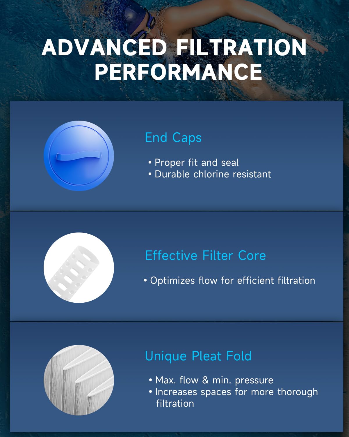 - 💧【Great Filtration Performance】Innovated "Dirt-Locking" technology makes the fabric filter much more contaminants than regular fabric. AQUALTRA hot tub filter cartridges effectively reduces hair, leaves, dust, sediment, sand, etc., providing you a clean and comfortable swimming space to enjoy your spa or pool.
