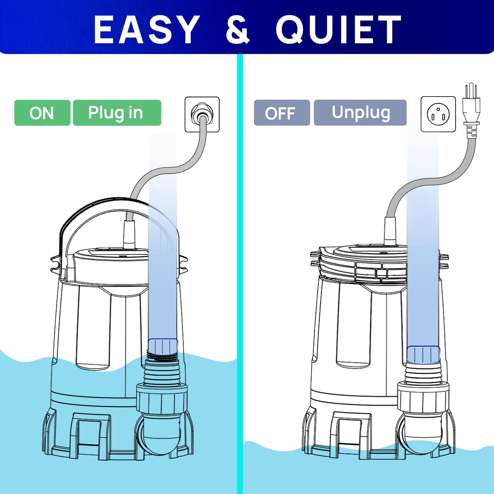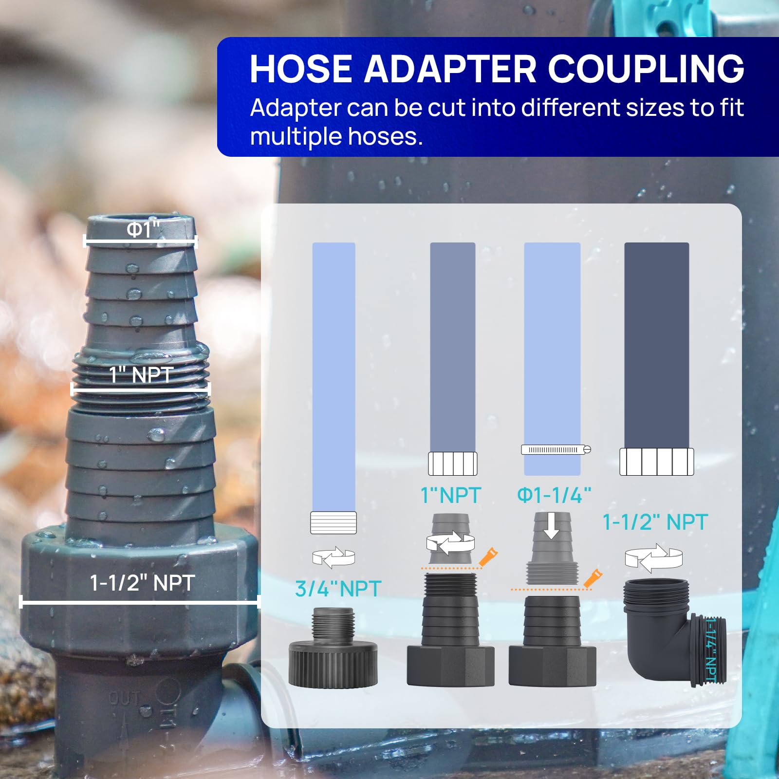 - Easy Installation: 1-1/4'' NPT discharge comes with 1-1/2'' elbow adapter and snap coupling adapter of 3/4'', 1'' or 1-1/4'', which makes Submersible pump easy to install. 10ft UL power cord provides safety and convenience
