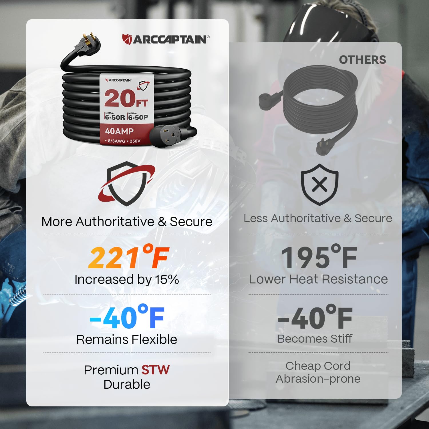 ARCCAPTAIN 40Amp 20ft Welder Extension Cord 8 AWG with Authorized Safety, 250V NEMA 6-50 Heat-Resistant Welding Cord 3 Prong for MIG/TIG/MMA Welder, Plasma Cutter